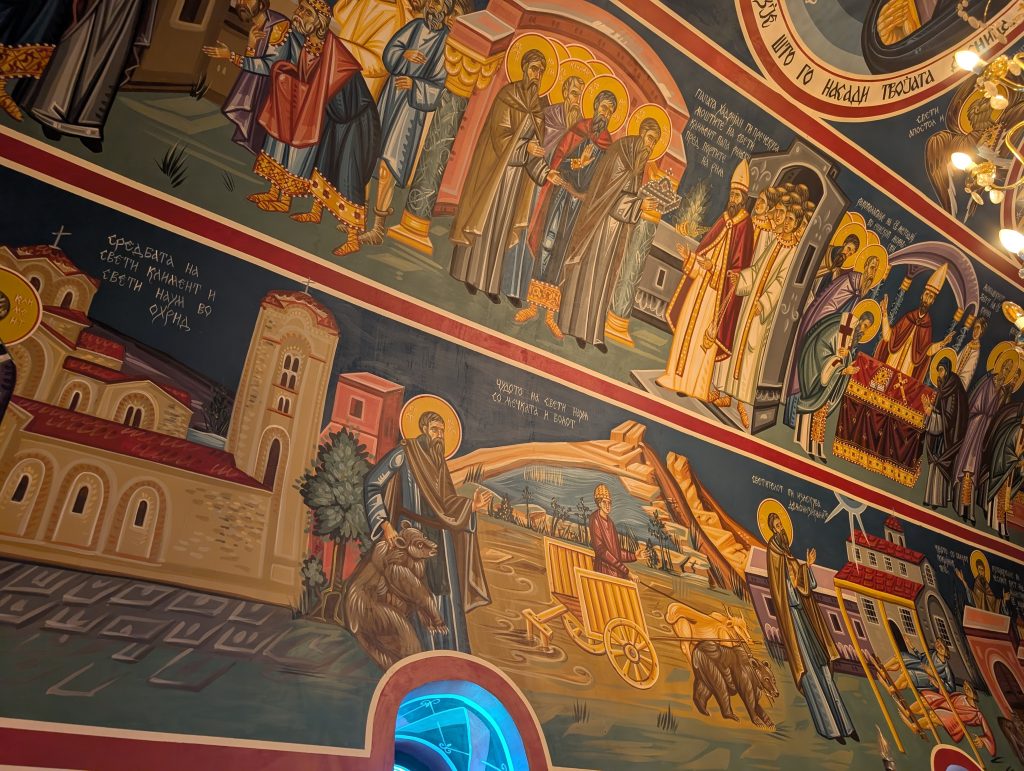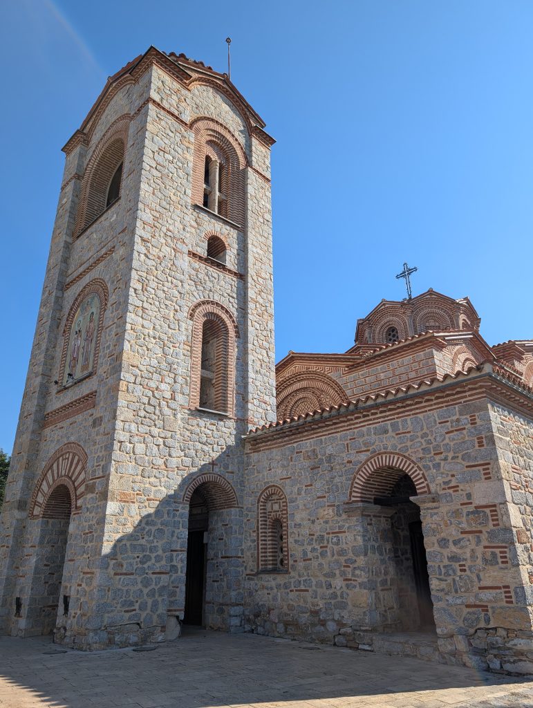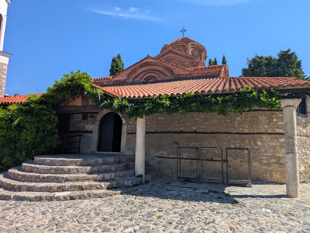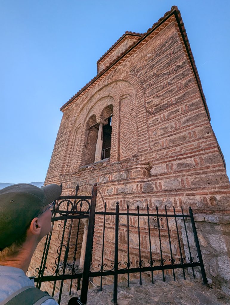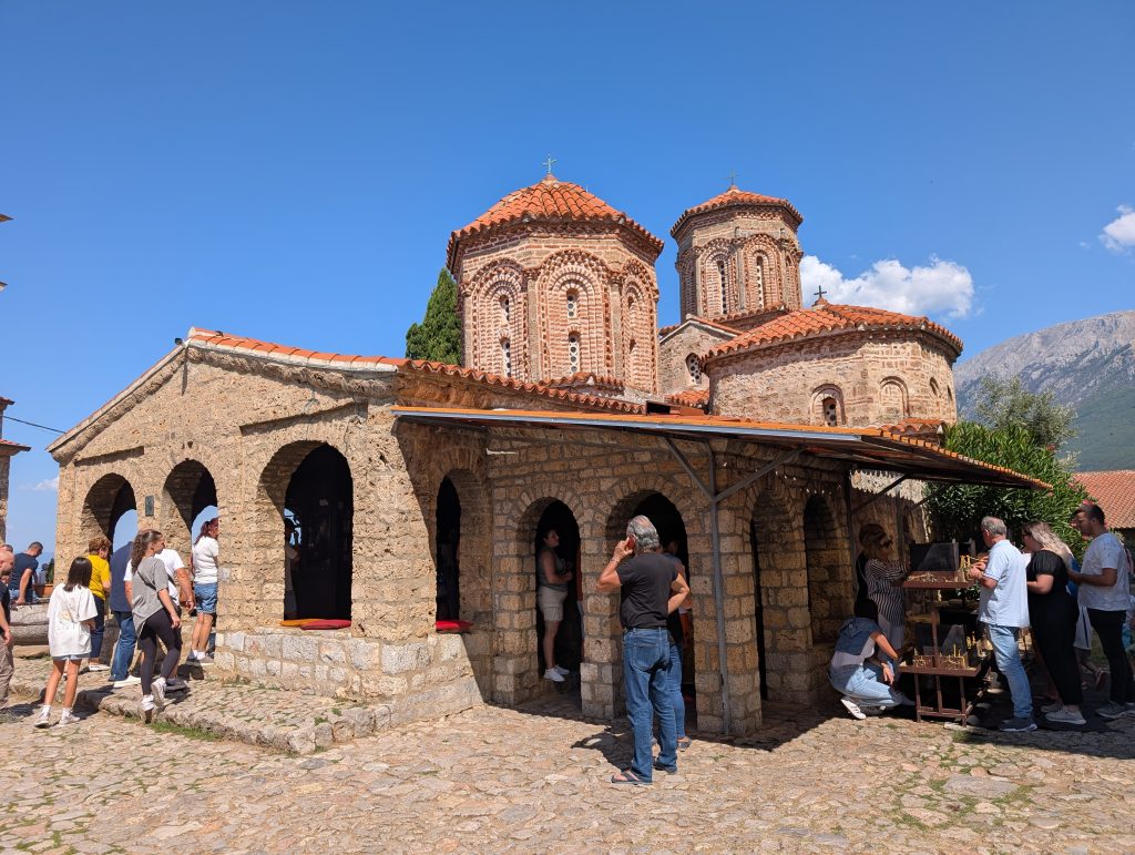 The next day was Saturday and Chad put together a little morning tour from us with the help of ChatGPT to visit several of Ohrid’s historic churches. Ohrid was a very important religious center from the 9th through 11th centuries and is sometimes called “the Jerusalem of the Balkans.” At one time it supposedly had 365 churches, one for each day of the year. The Ohrid Literary School, established in the 9th century, translated religious texts into Cyrillic and was essential to the spread of Orthodox Christianity. We visited five sites on our tour – three churches, a fort, and a gallery of religious icons. Each had a fee of 150 denar per person (about $3). Most accepted credit cards but a couple were cash only.