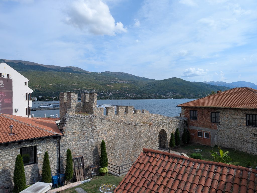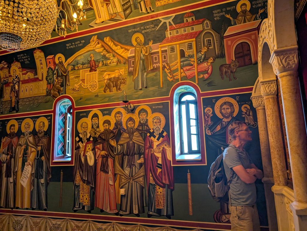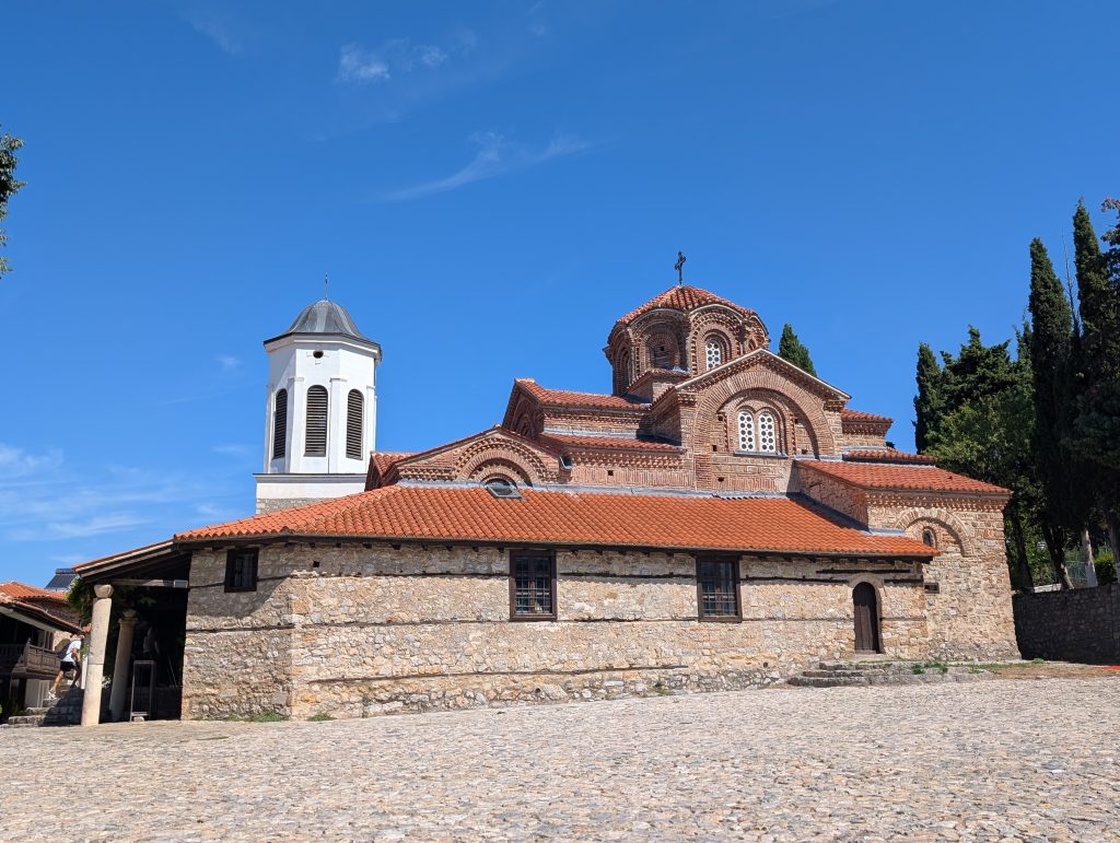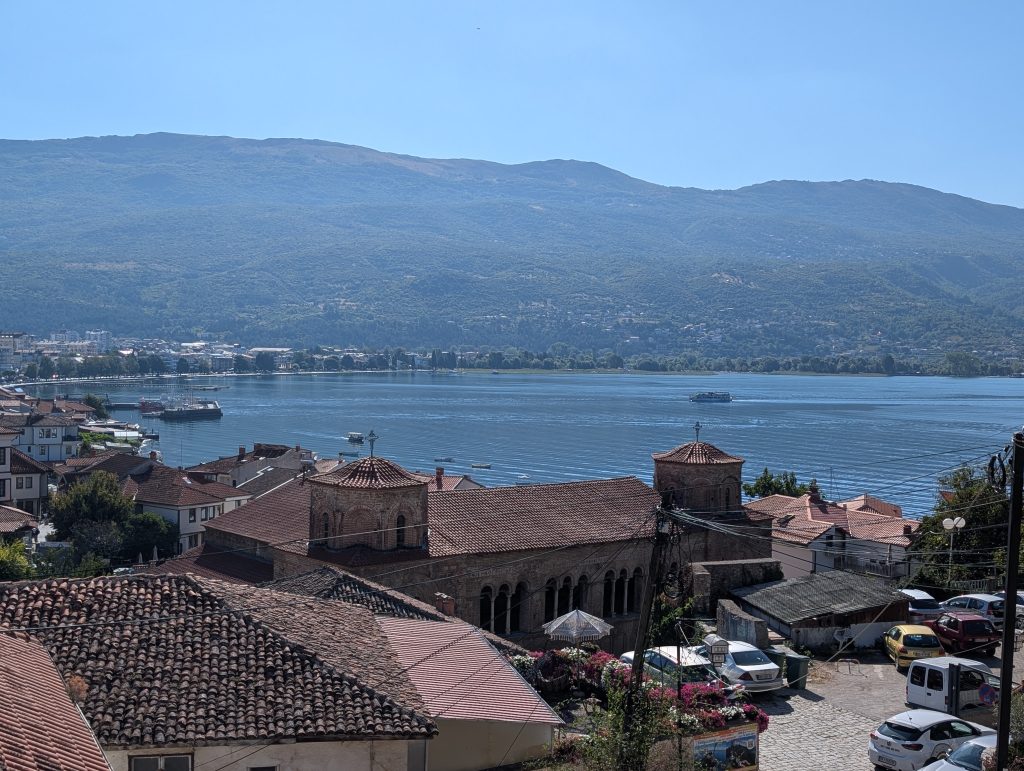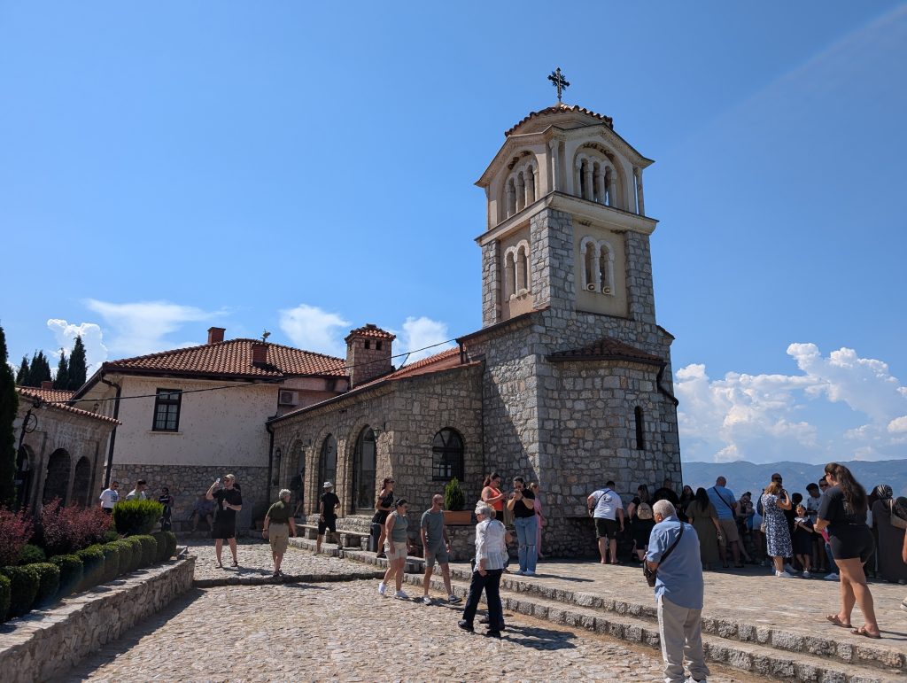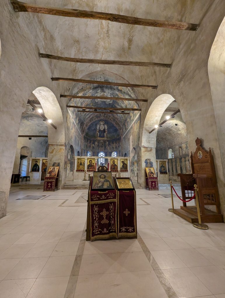 The next day was Saturday and Chad put together a little morning tour from us with the help of ChatGPT to visit several of Ohrid’s historic churches. Ohrid was a very important religious center from the 9th through 11th centuries and is sometimes called “the Jerusalem of the Balkans.” At one time it supposedly had 365 churches, one for each day of the year. The Ohrid Literary School, established in the 9th century, translated religious texts into Cyrillic and was essential to the spread of Orthodox Christianity. We visited five sites on our tour – three churches, a fort, and a gallery of religious icons. Each had a fee of 150 denar per person (about $3). Most accepted credit cards but a couple were cash only.