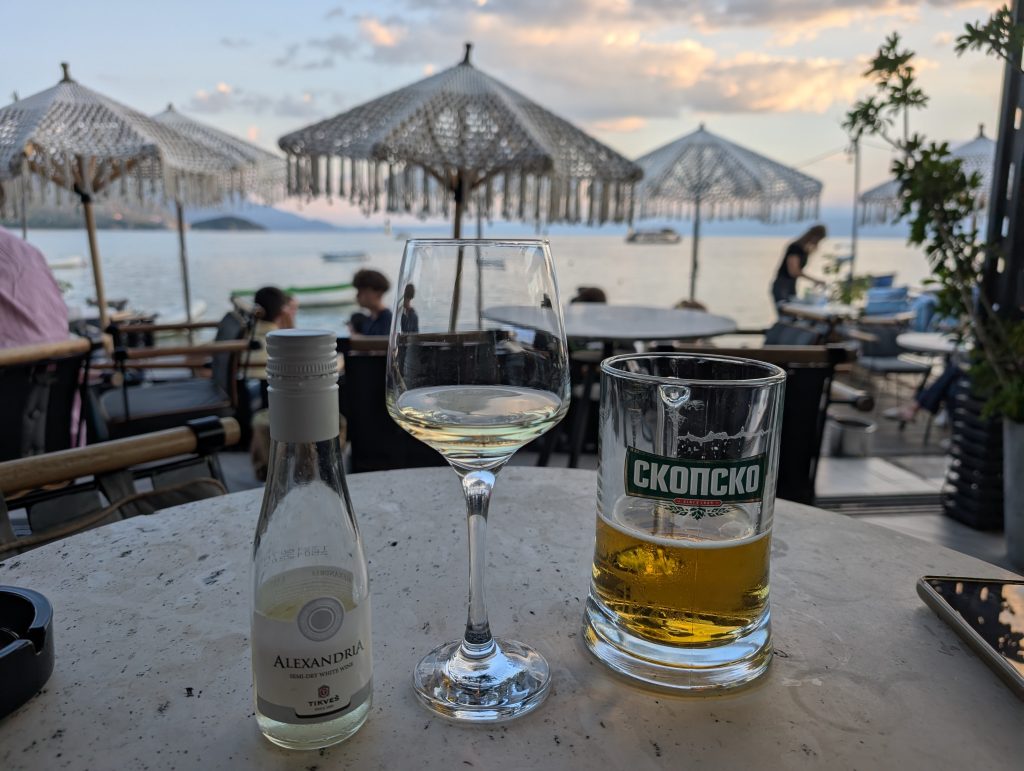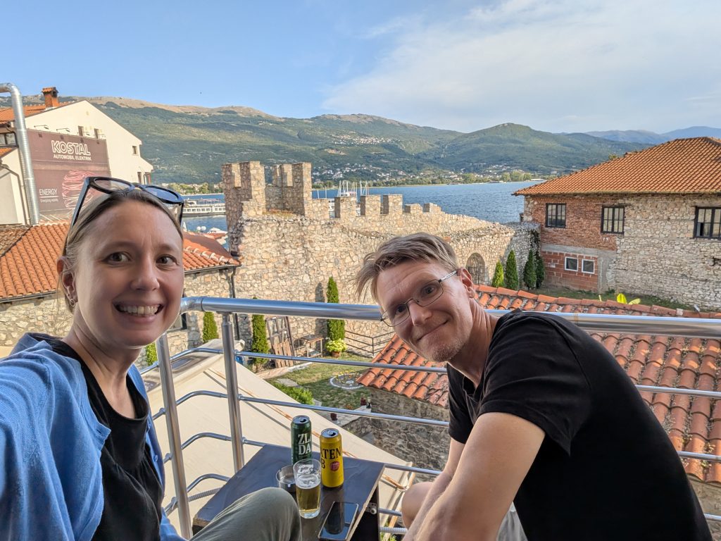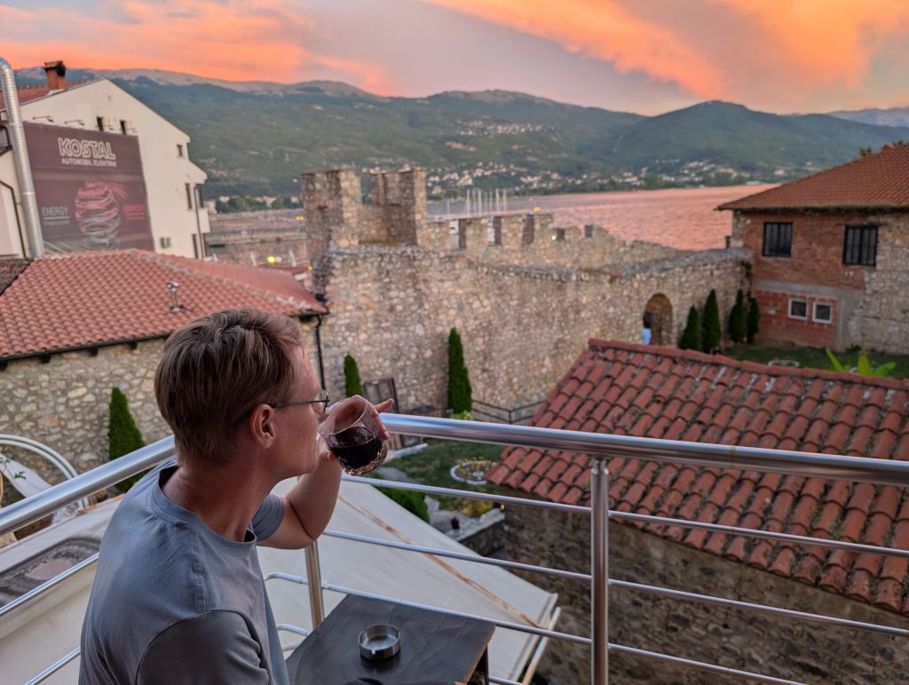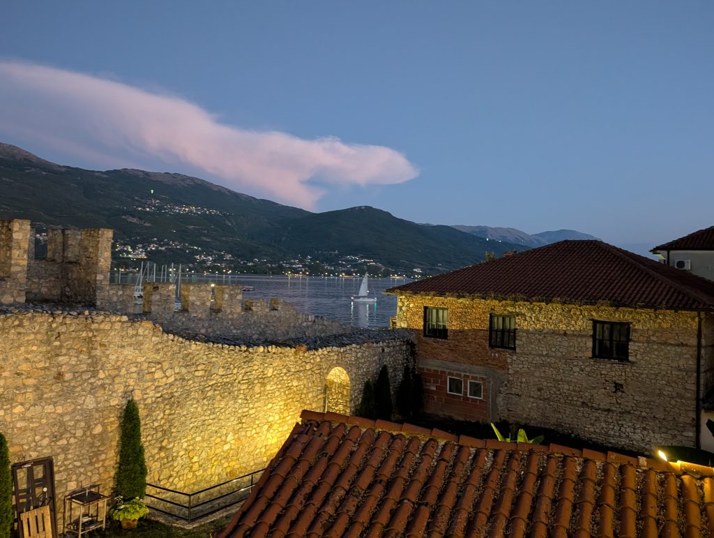After a rest, we decided we were up for a little more sightseeing, so we visited the Robevci Family House museum, a 19th century house with displays from the Ohrid cultural association, including many of the archeological findings from the area. Then we walked back up the hill to the Fort Cafe to enjoy a nice beer with a view, realizing our next/final day’s plans might not allow for it. We enjoyed it as expected then headed home to enjoy the sunset from our balcony and our stir fry leftovers.