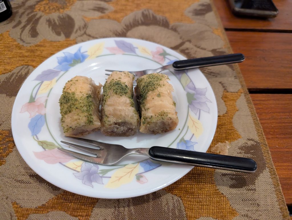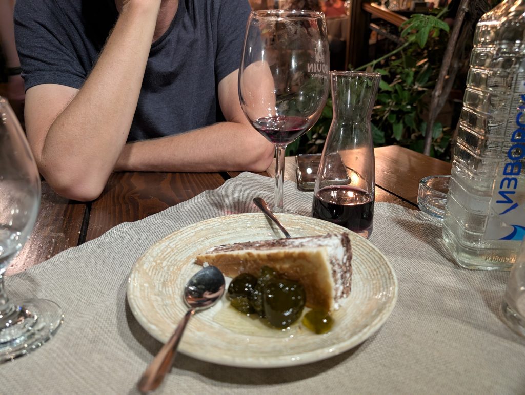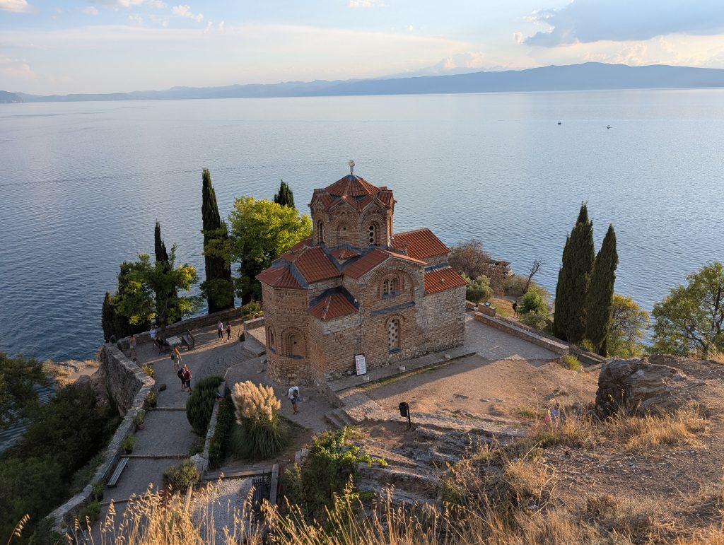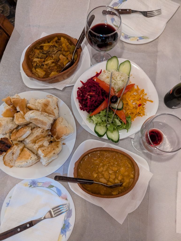 We preceded our reservation with an evening walk along the lake and out to the Church of Saint Jovan the Theologian at Kaneo, the most picturesque of Ohrid’s many historic churches, as it sits on a point overlooking the lake. We took some nice photos and then stopped for a drink at a lakeside bar. The restaurant was a great choice and we loved our meal of mixed salad, tavče gravče (the bean dish we’d tried in Skopje), turli tava (a vegetable stew that is another national dish), and traditional bread. We also got some baklava for dessert.