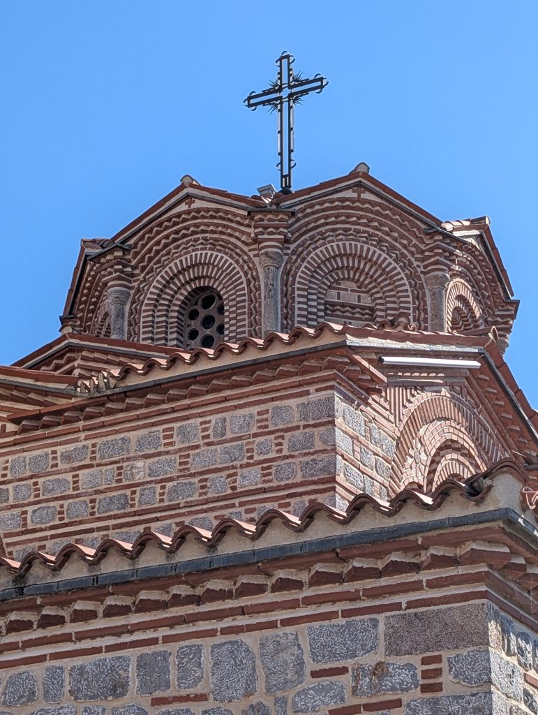 From there we went up Ohrid’s steep hills to the Plaoshnik Archaeological park and Church of St. Clement of Ohrid. This church was interesting because it was rebuilt rather than restored, with fresh bricks and new frescoes painted on the inside. Unfortunately they didn’t allow interior photography, but it provided a great sense of what the frescoes at all the churches would have looked like when new. The exterior also showed off the interesting patterns in the brickwork that were traditionally used.