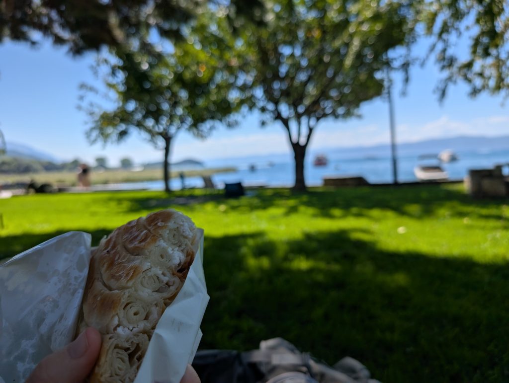 We capped our tour with a picnic of Macedonian burek by the lake. Burek is a traditional pastry found in several Balkan countries made of filo dough and filling. We got one with meat and one with cheese from Bakery Lihnida and they were very tasty.