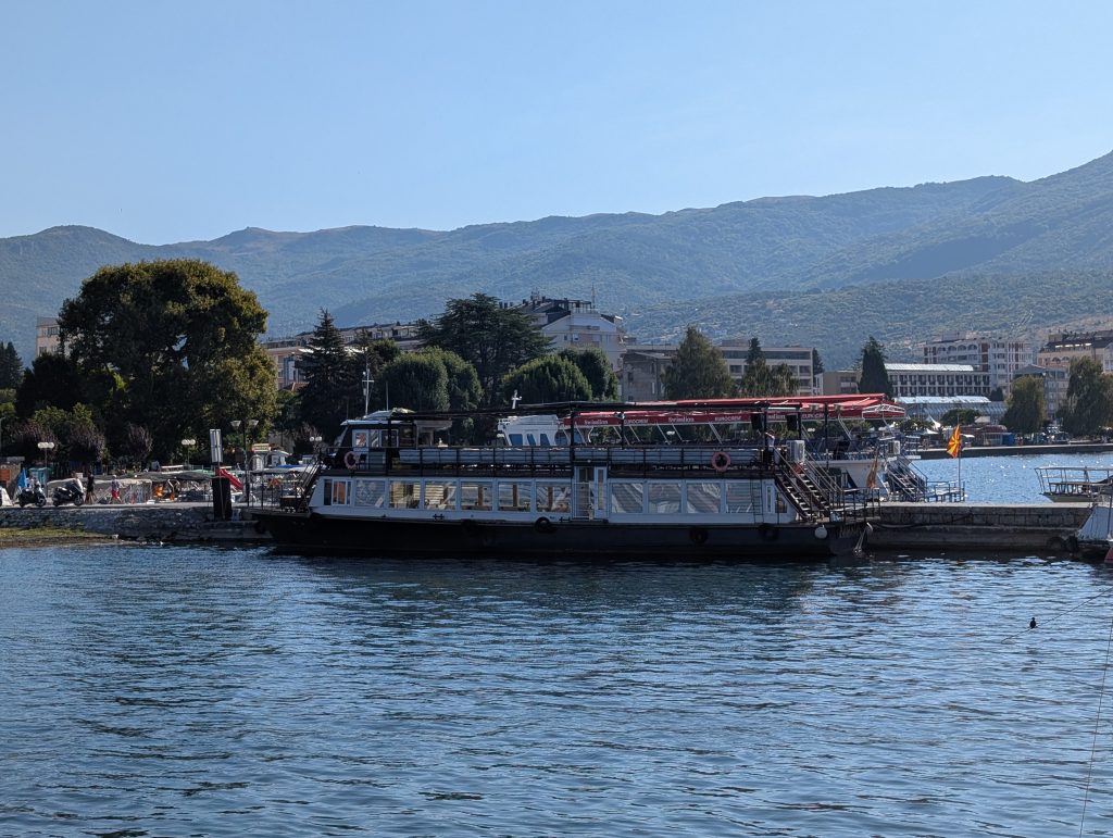 Sunday was our last day in Ohrid and we booked a full-day tour to cross the lake to St. Naum on the Boat Armada. We arrived early to make sure we’d get upstairs seats, though I wish we’d chosen the right side of the boat rather than the left, because we’d have had more shade in both directions. But with our hats it wasn’t too bad and it was nice to be on the water.