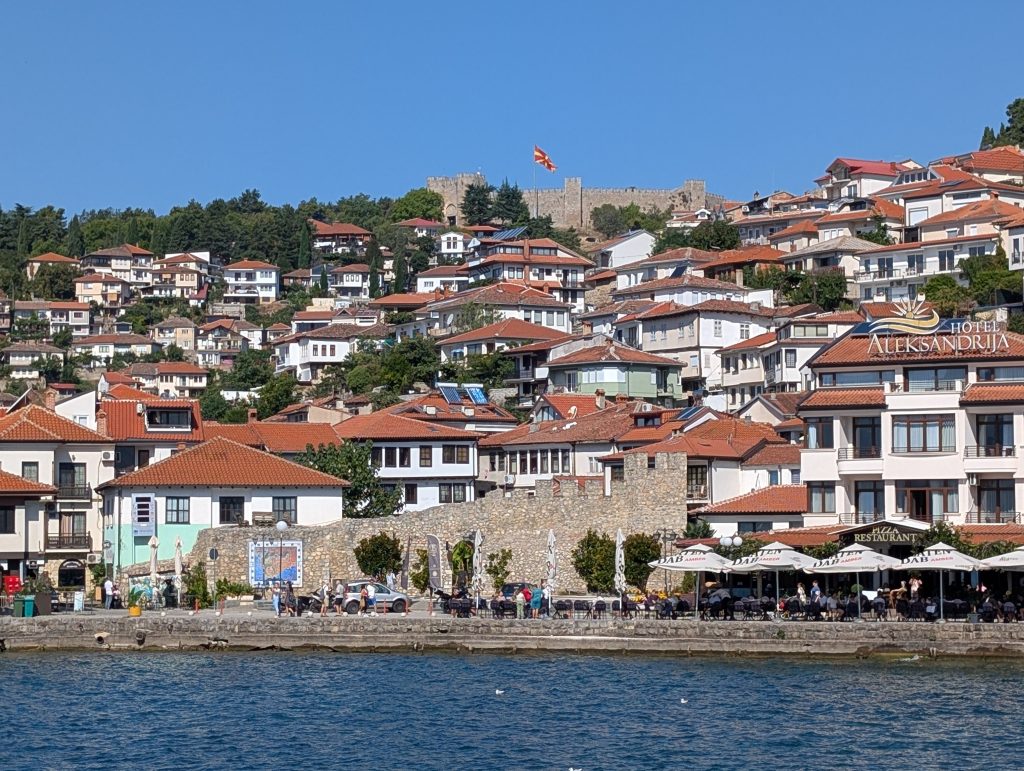 We found a taxi outside the bus station to take us to the old town. The quoted price was 400 denar (about $7.50), which may have been a little high for a 2 kilometer ride, but typical for a tourist town and worth it to us. Our Ohrid Airbnb host met us at a pizza restaurant next to the apartment and showed us the place up one flight of stairs (review below). It was a little dated but well worth it for the views. When I opened the blinds in the bedroom and saw the view from the balcony, I actually laughed, it was such a charming view of the lake. When researching Airbnbs, Chad and I had actually debated whether it was worth choosing a place with a lake view because we have a great one at home, but it was definitely worth it and we got a lot of enjoyment from the little balcony.
