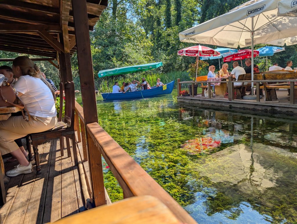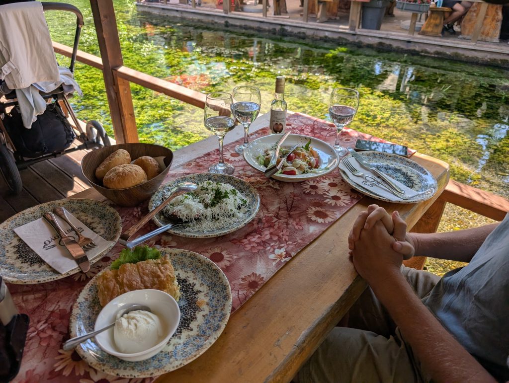 We started our time in St. Naum with lunch, which was the right call because we lucked into a great table at Restaurant Ostrovo on a platform overlooking a natural spring that feeds into the lake. I’d researched this restaurant as having good vegetarian options but didn’t realize we’d have the fun seating as well. Our Macedonian meal was great again – salad with smoked trout, grilled eggplant with shredded cheese, a spinach pie with yogurt, and bread.