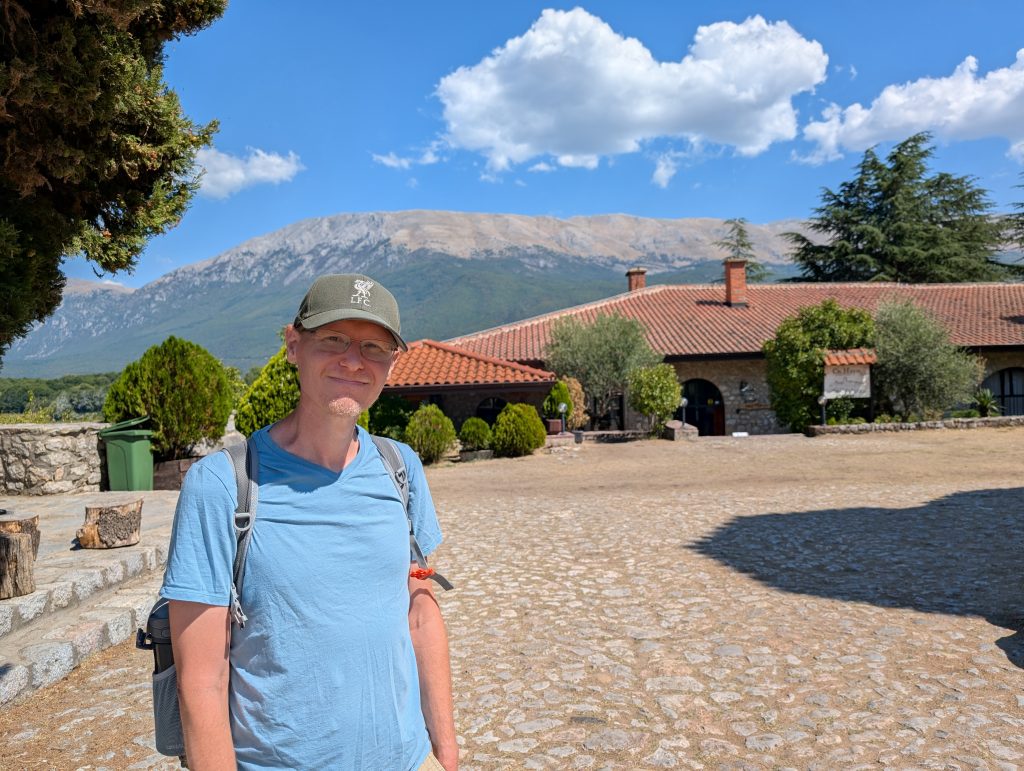 We first stopped at the Bay of Bones, about 90 minutes by boat to the south, which is a reconstruction of Bronze and Iron Age stilt houses. It struck us as a bit of a tourist trap so we just stretched our legs and returned to the boat. After another 30 minutes ride, we arrived at St. Naum, a small town near the border with Albania named for the old monastery there, where we’d have about three hours of free time to explore.