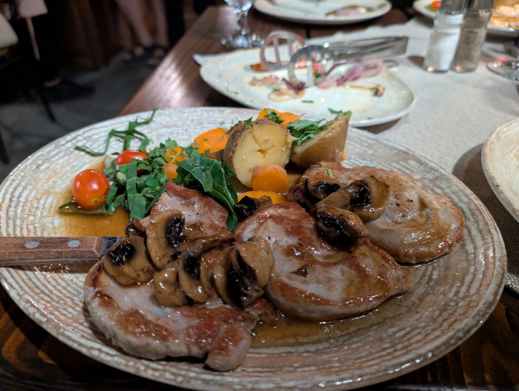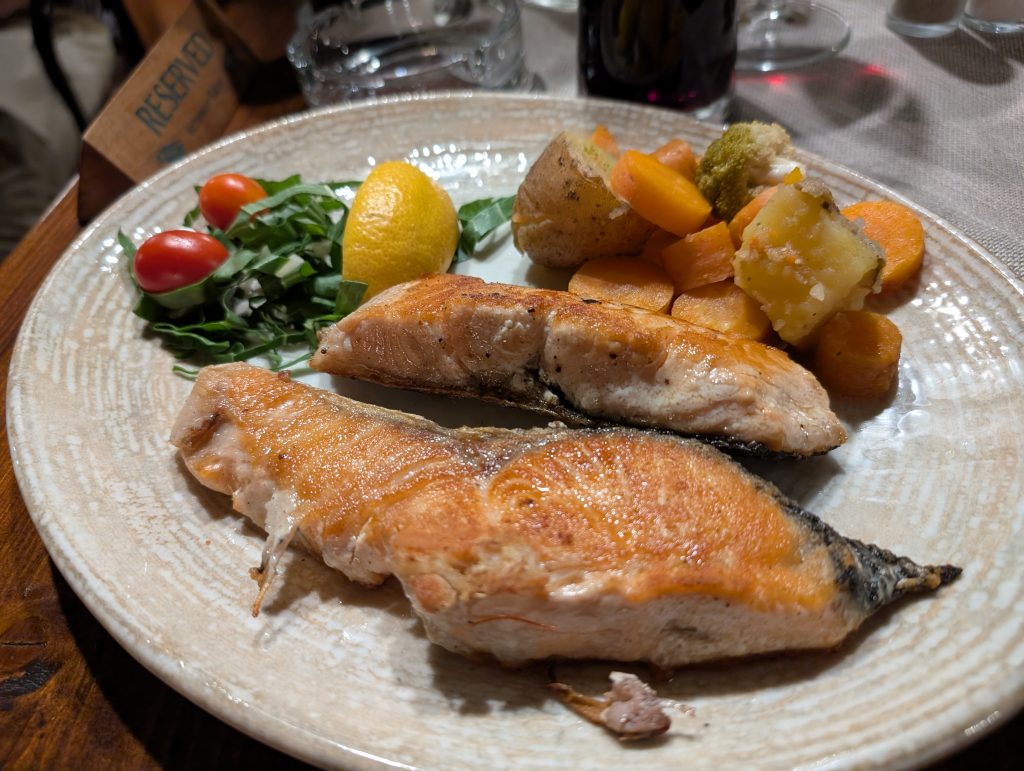 Our last meal out was at a lakeside restaurant I’d read about on a blog. We’d tried to get a Friday night reservation on our walk that day, but they were booked up so we made our reservation for Sunday night instead. We didn’t get much sense of being on the lake since it was dark but the atmosphere was nice and the food was good – salmon, pork with mushrooms, and a dessert inspired by Ferrero Rocher chocolate.