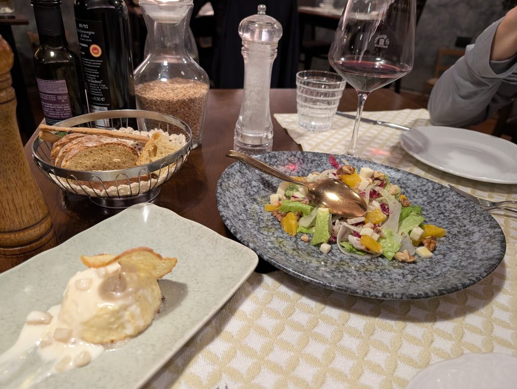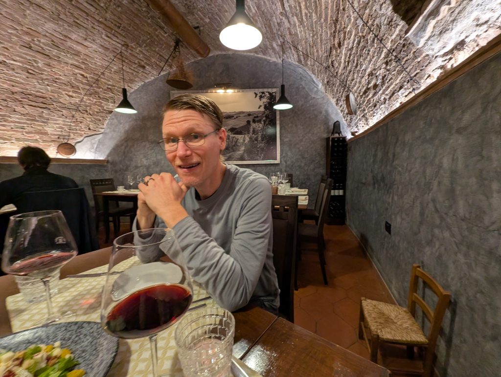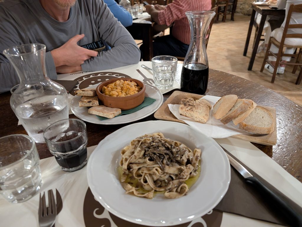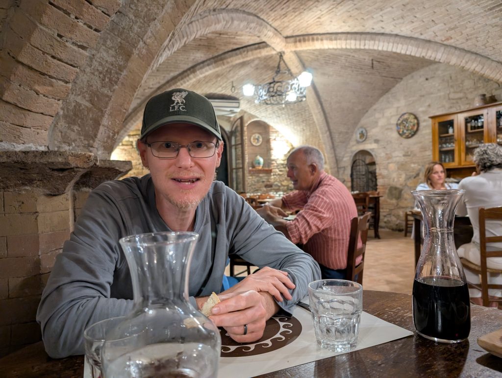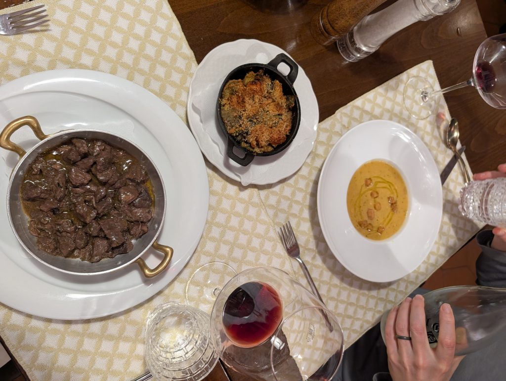 Our highlight meal in Perugia so far was dinner at a restaurant mentioned in the Michelin guide for at least the last three years. It was also Umbrian regional cuisine but made slightly upscale. We had a really fantastic meal of cheese souffle (a first for us), mixed salad with fennel, chickpea soup, wild boar stew, and gratin vegetables, paired with a couple of glasses of Montefalco wine, including the famous sangratino. It was a wonderful splurge and we enjoyed it a lot.