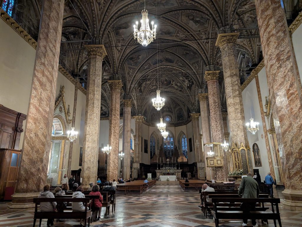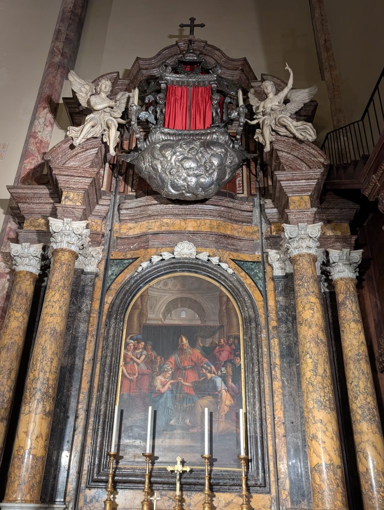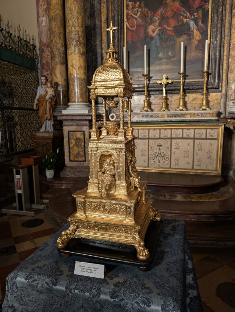 After, we went to check out Perugia’s cathedral, Cattedrale di San Lorenzo, from the 1400s. Its big claim to fame is possession of a ring associated with the wedding of Mary and Joseph. As far as relics goes, this one sounds pretty unlikely to me (similar to the idea that they’d have been able to find Jesus’s manger, which we saw in the Basilica of Santa Maria Maggiore in Rome on our last visit). The ring on display is a replica. The original that was “discovered” in the late 1400s is kept in a locked box with 14 keys held by local dignitaries behind an iron gate in a silver cloud above the altar, behind the red curtain. They bring it out for veneration twice a year. We enjoyed the quirk of this relic. And the church itself with its art and stained glass is quite lovely.