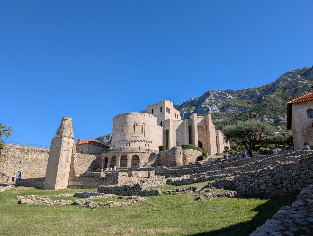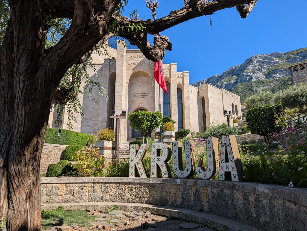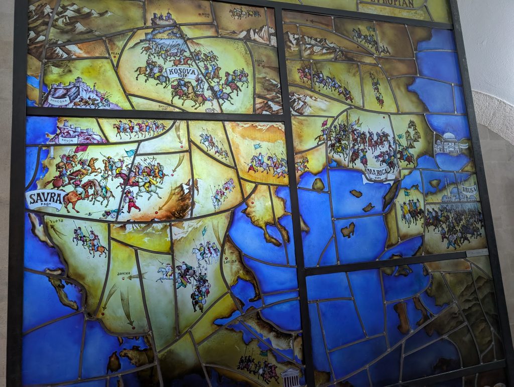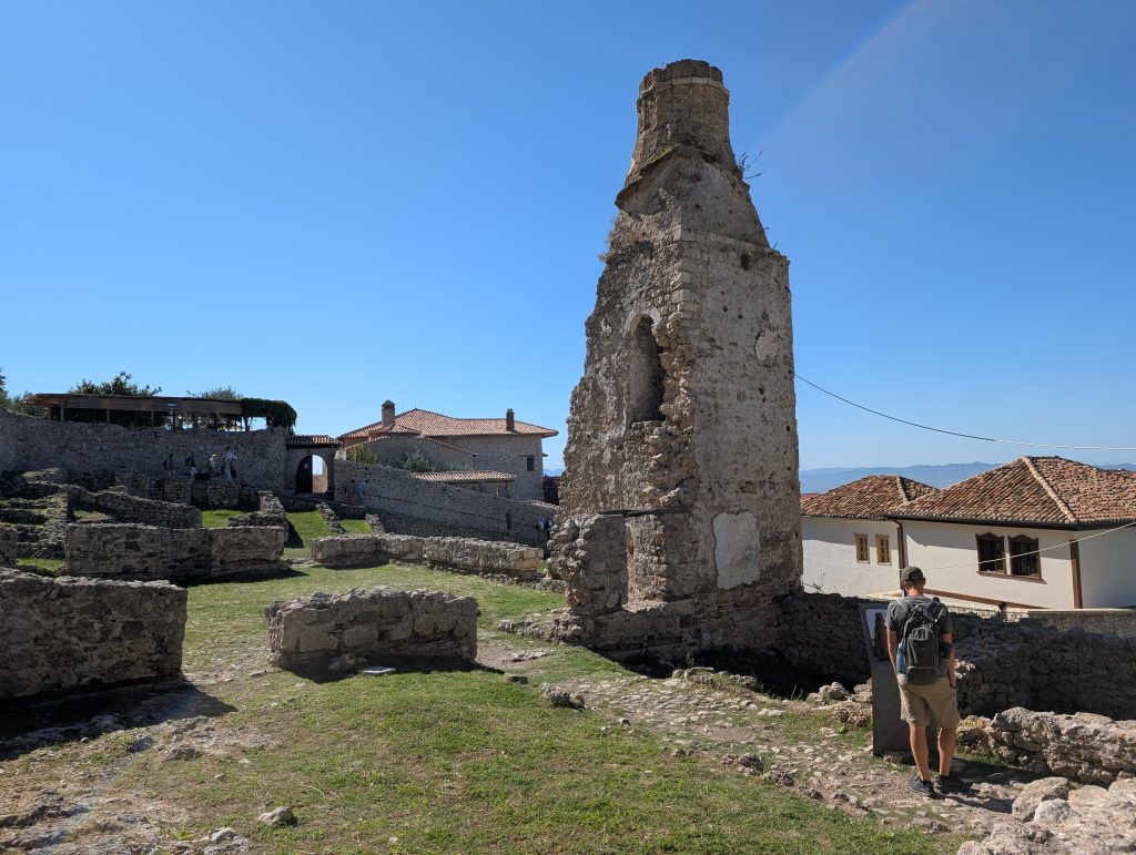 We walked up to the fortress first and explored around that area. It was very picturesque and had great views. Then we spent about an hour looking through the museum (500 lek or around $6 for entry). Skanderbeg really was an interesting and impressive person. His Wikipedia https://en.wikipedia.org/wiki/Skanderbeg page also tells his history well, but the museum did a great job bringing it to life. The highlight for us was the area screening a 1950s Russian film called The Great Warrior Skanderbeg, which has English subtitles. It’s available on Youtube and we’re tempted to watch it sometime, though we haven’t yet.