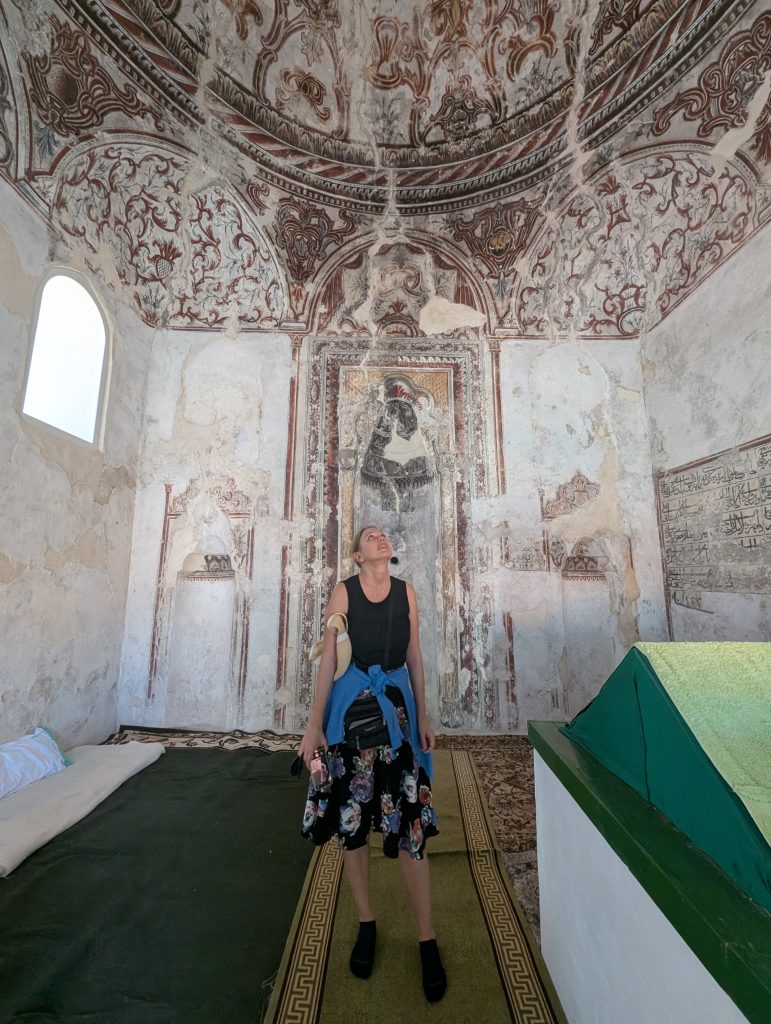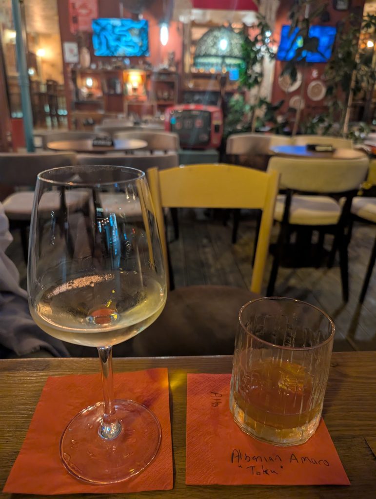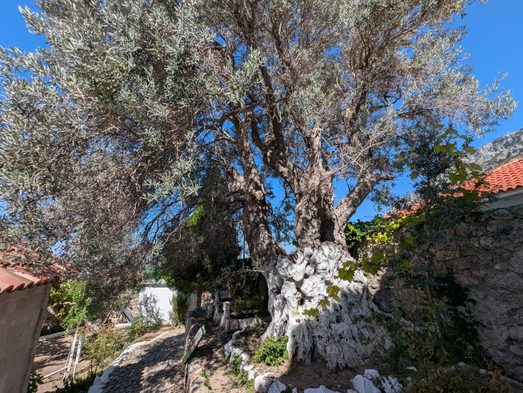 After the museum we explored the area near the fortress more, including a 500-year-old olive tree supposedly linked to Skandeberg and a little mosque. On our way back through town, we walked through the Old Bazaar area, which was cute but very touristy. It was after noon but we weren’t hungry for lunch due to the veggie sandwiches. So we decided to just take the bus back to Tirana. We elected to wait for the direct bus at 1 p.m. Cash only for all the busses but they were very inexpensive (I think 120 lek per person each way) and the driver gave change as needed.
