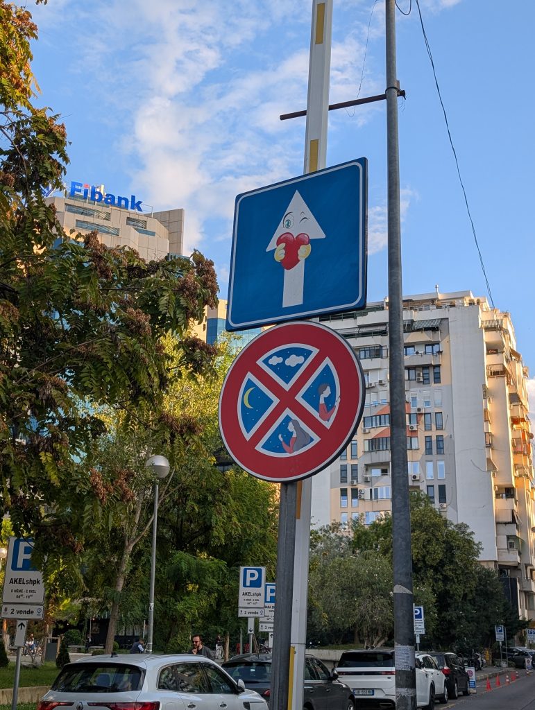 Most of the details escape me now, but here are the photos of the various skyscrapers and street art, including whimsical street signs. Our favorite building was the one built to look like the head of Skanderbeg. Kedric said when it is finished, the architects intend to plant vines on the lower floors to look like his beard. We hope to see photos when that happens.