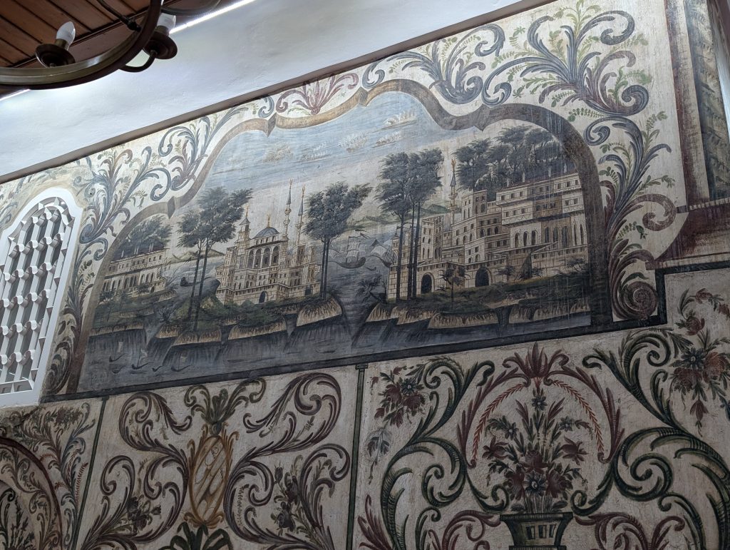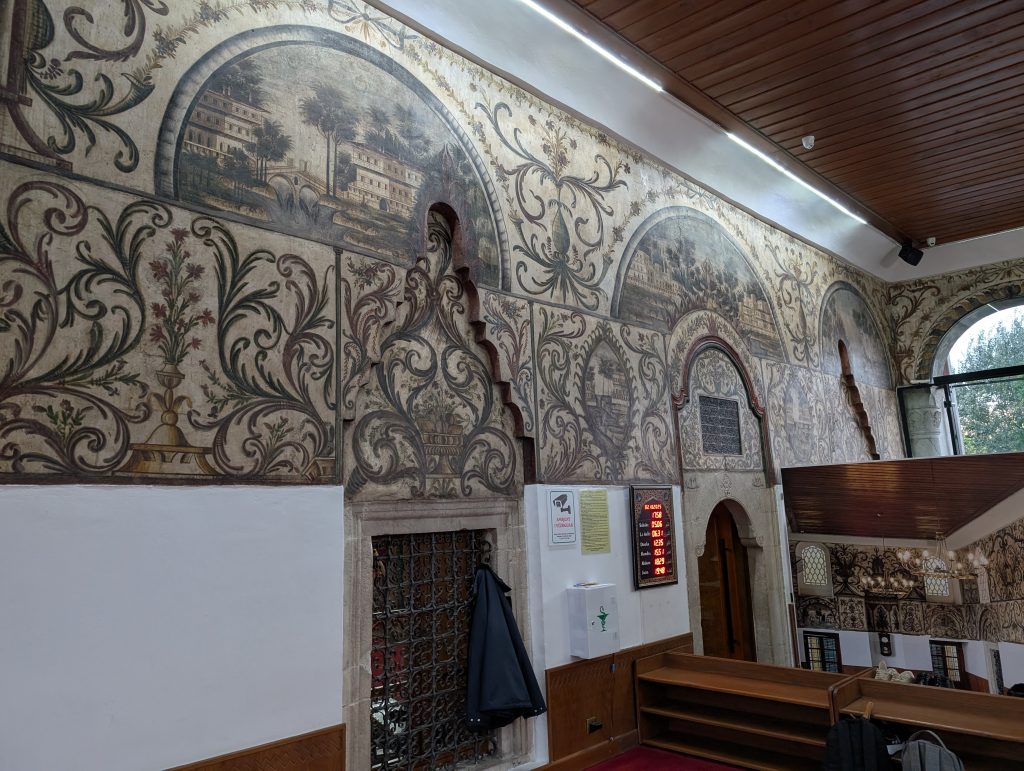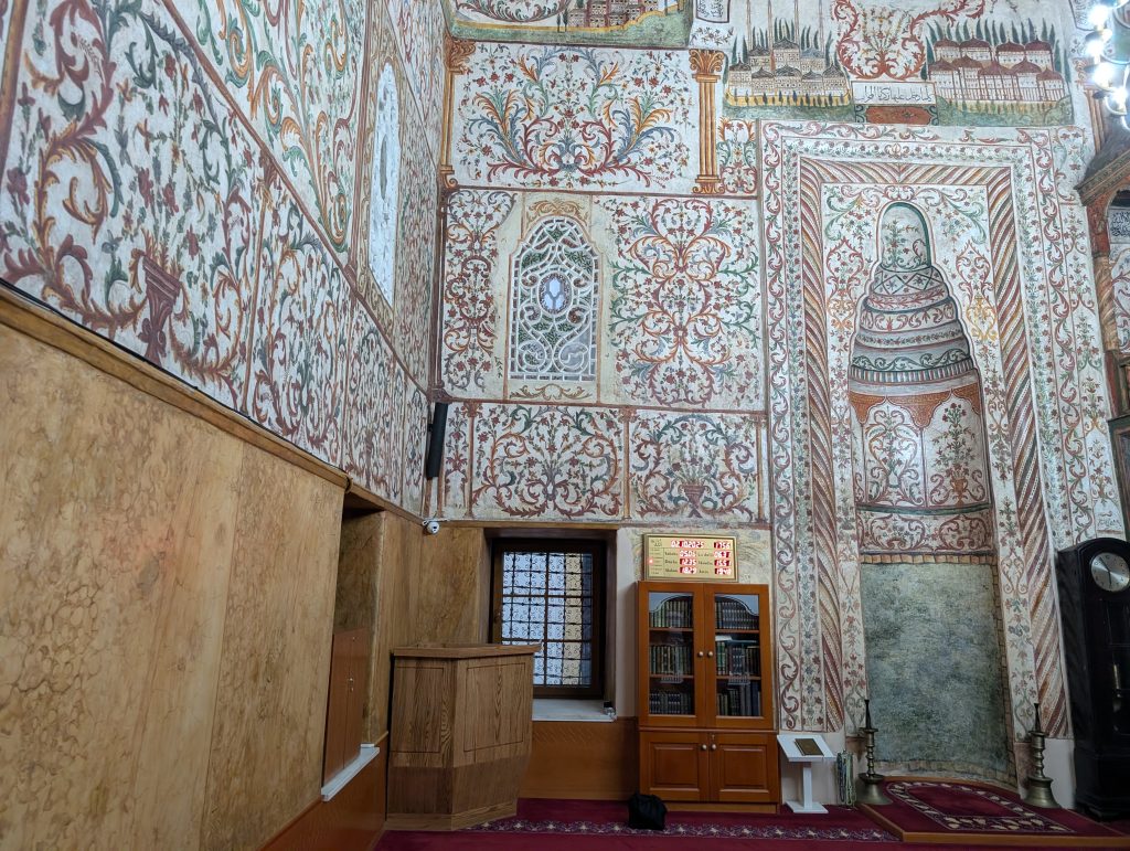 After the museum, we made a quick trip to to see the Et’hem Bej Mosque, an 18th century mosque near Skandeberg Square that we’d learned about and admired on our first walking tour. It is beautifully frescoed outside and in and really worth seeing. We got lucky that we arrived about 15 minutes before the 6 p.m. (I think) closing time. Google Maps said the closing time was an hour later. The caretaker allowed us in and we had plenty of time for photos but when we were leaving 10 minutes later, we noticed him turning others away. I think we just missed the cutoff time. The three night photos below are from later in the evening after we had dinner out, including one of the mosque exterior.