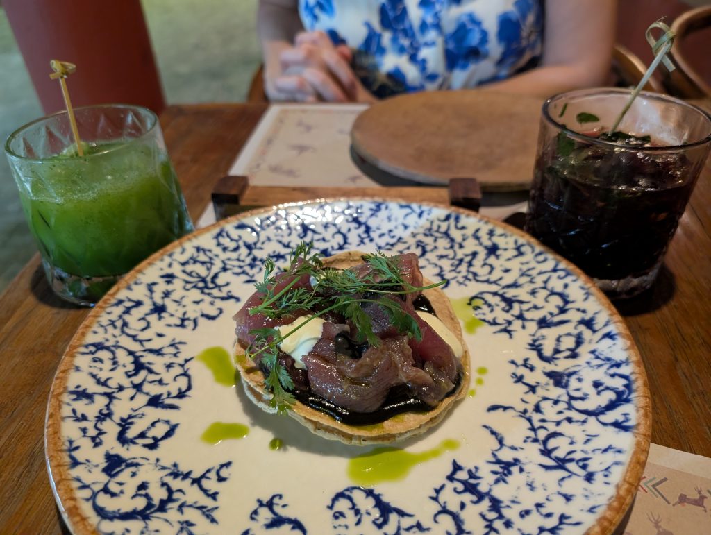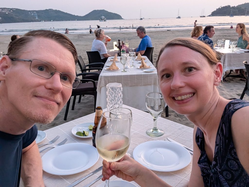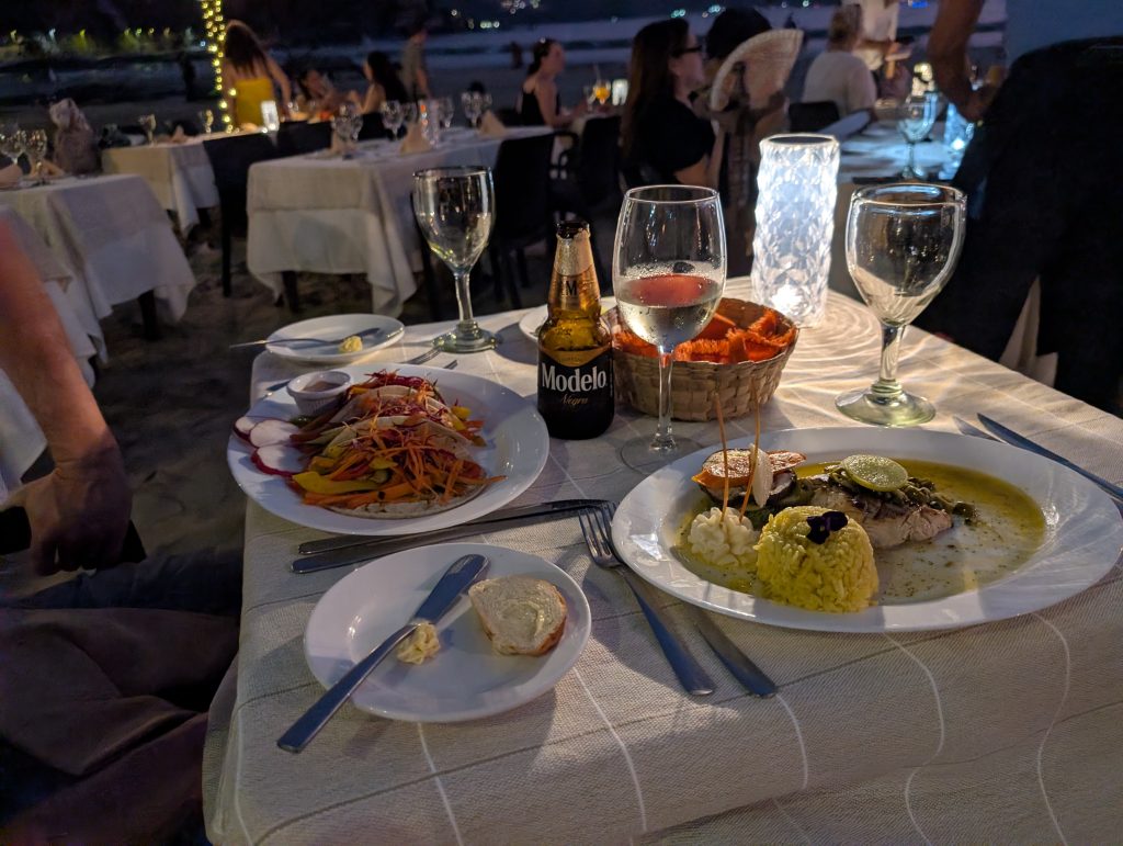 We’ve chosen La Madera for our beach days because it is a little calmer and more spacious with plenty of spots to put out our beach blanket. The few restaurants on La Madera are a bit farther back from the water there, creating more space. The day after we arrived in Zihua, we had our first date night at one of these restaurants, which was called Restaurante Maderas and was excellent. It was interesting eating a white tablecloth meal on the sand.