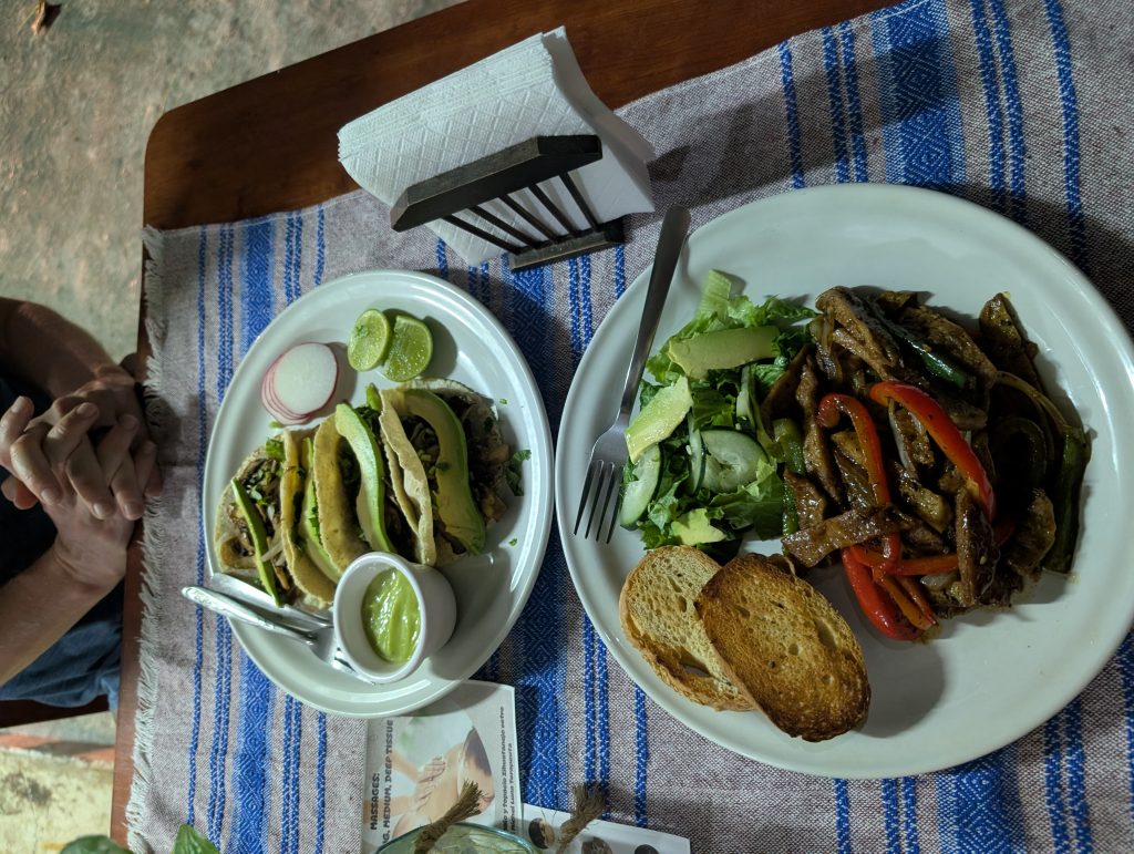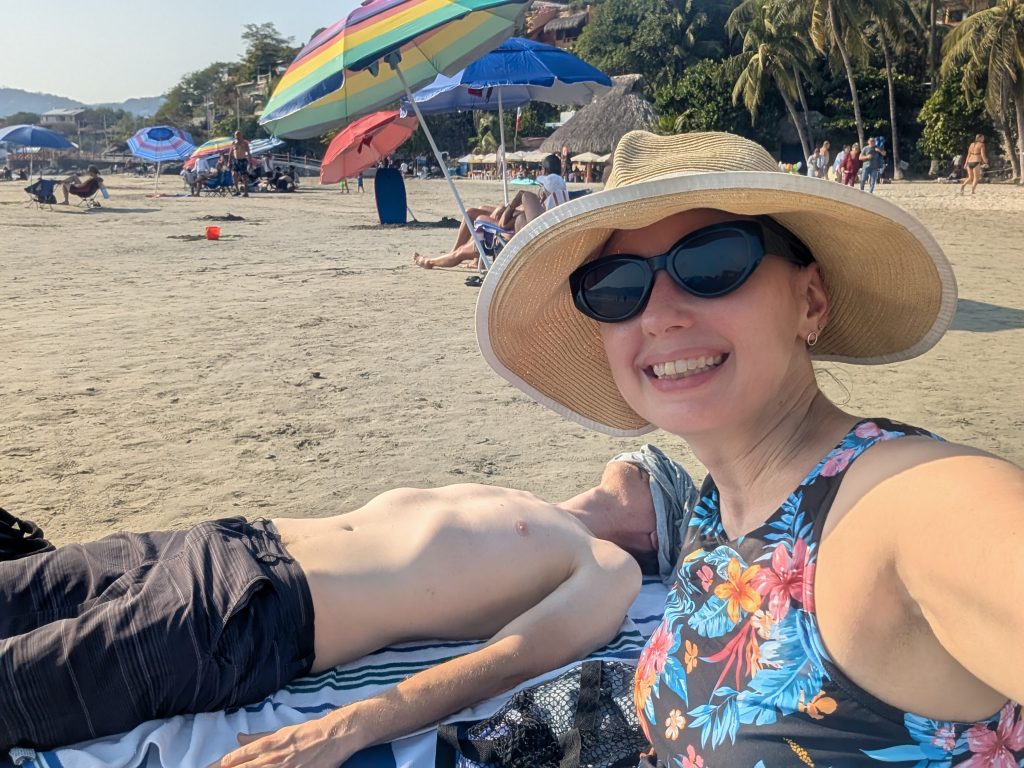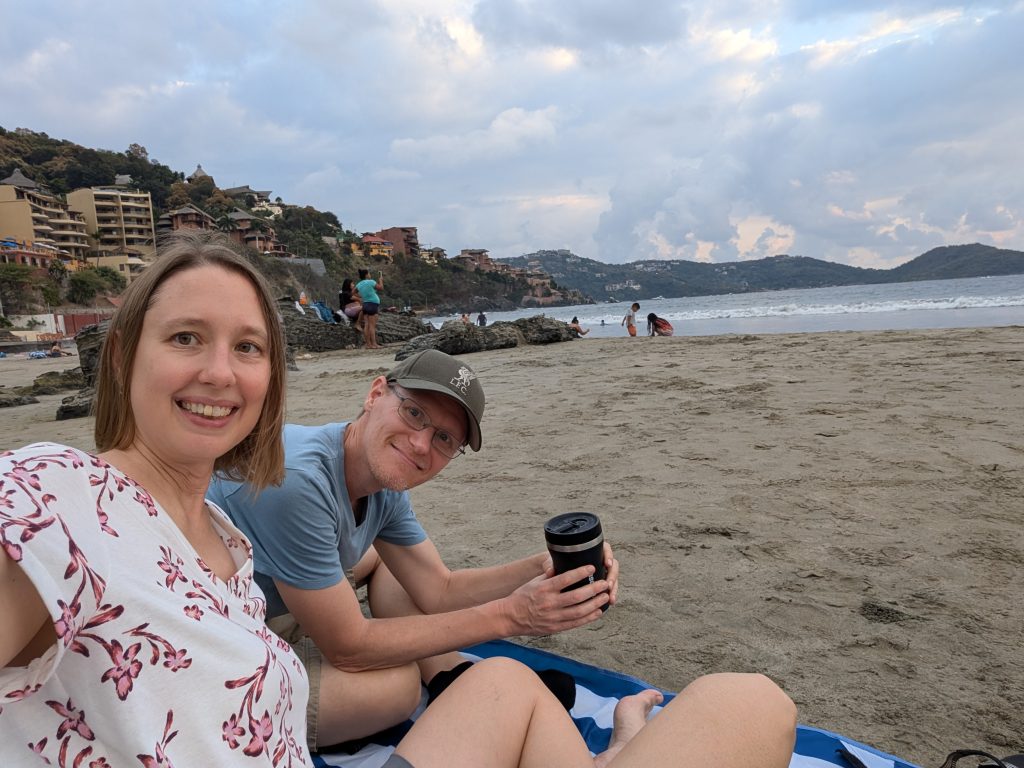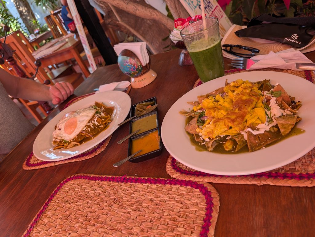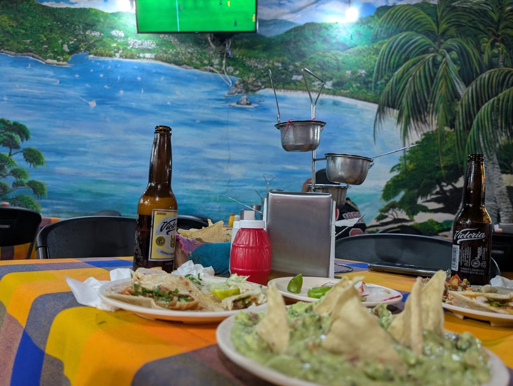 Otherwise, our life in Zihua is very normal – work most days, walks most days, beach a few times a week, and great Mexican meals at home and when dining out. Every meal we’ve had so far has been excellent. The standout meal at home was a fresh-caught dorado (mahi mahi) that I bought with Ami at the market that Chad served with verde sauce (made with tomatillos and other veggies from the market) and Mexican corn and zucchini. Our weekly rhythm has been eating out two nights a week plus a brunch or lunch out. On the days we eat out at lunch, we do a simple snack dinner (often popcorn, my favorite). This has worked well for us and felt pretty healthy.