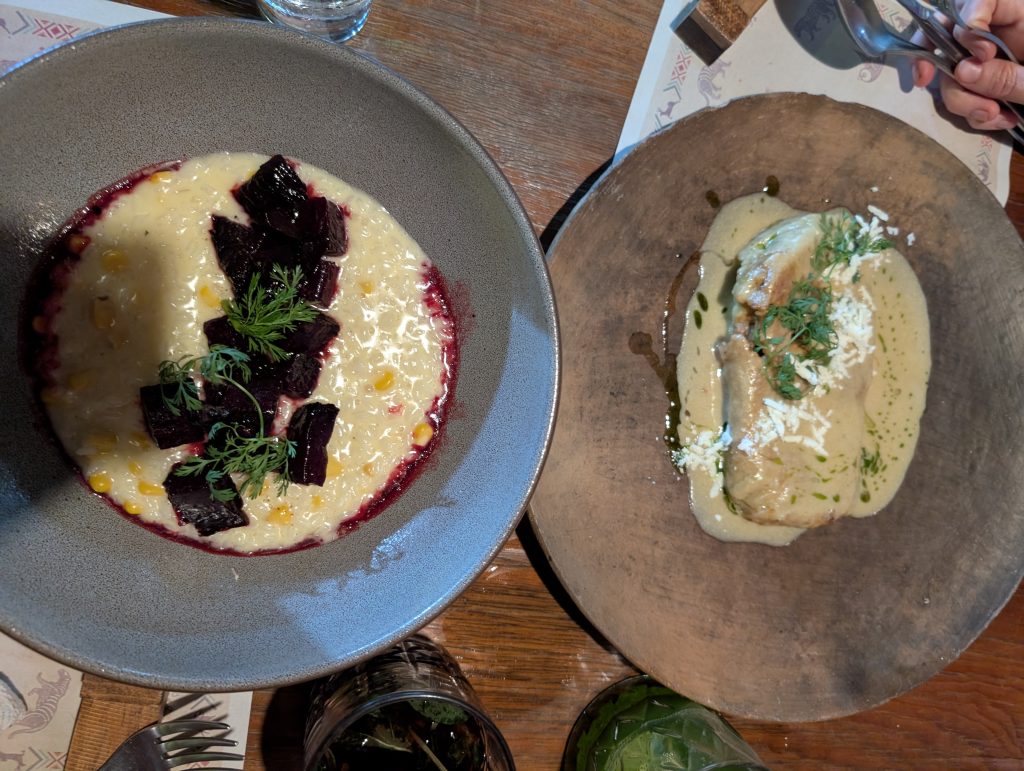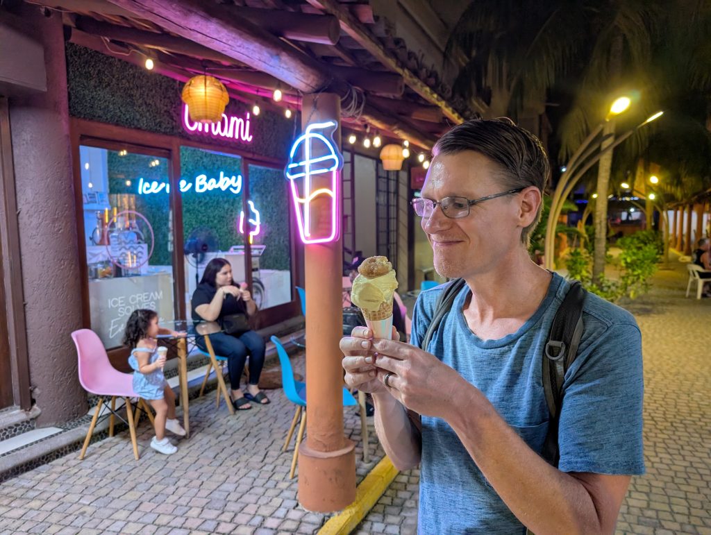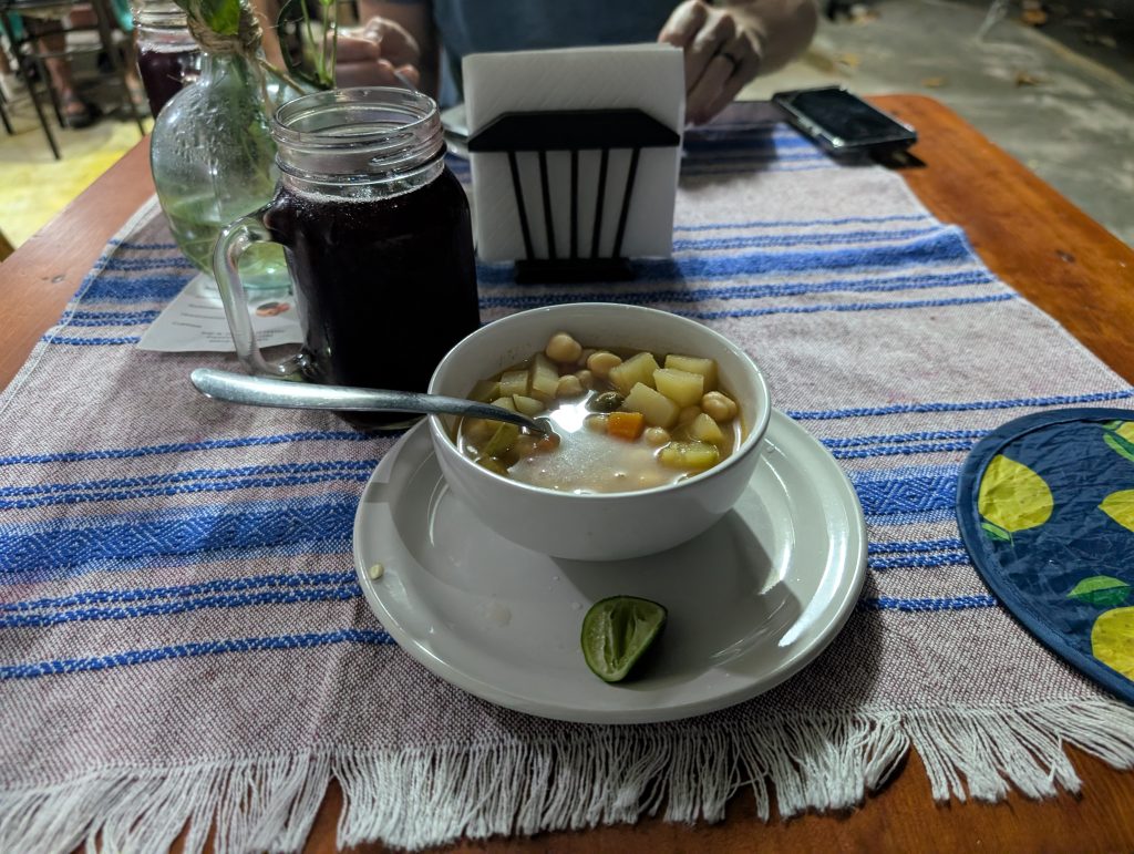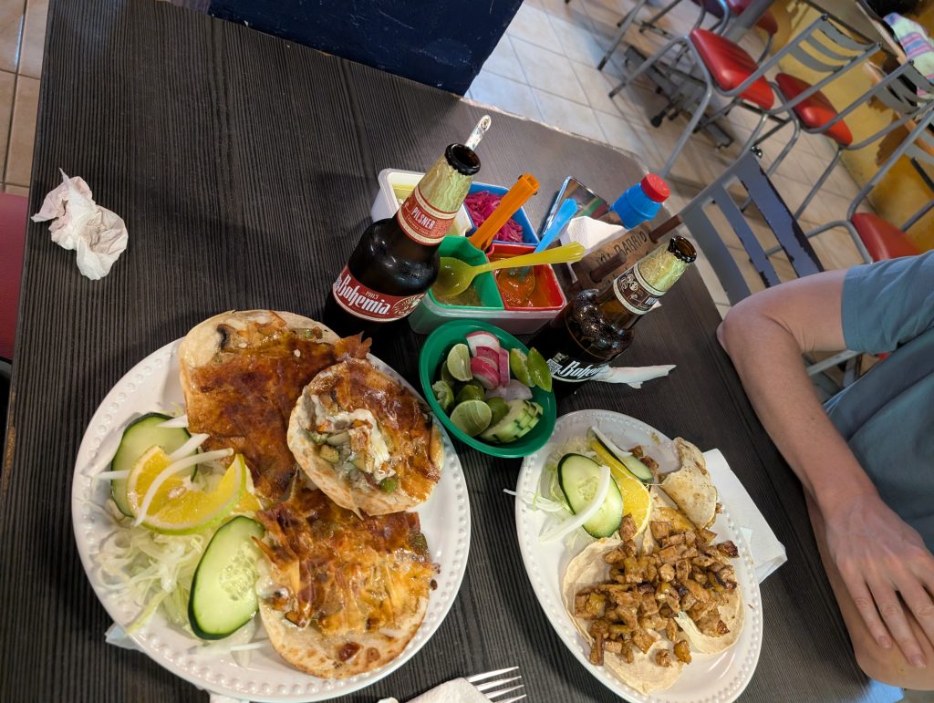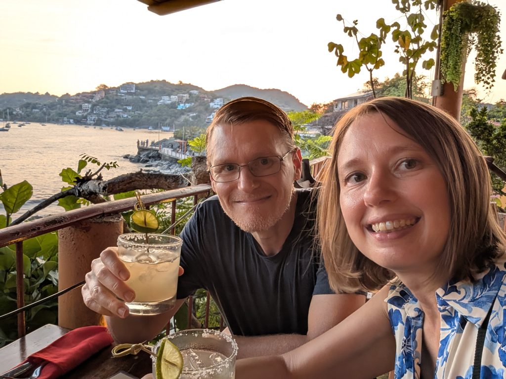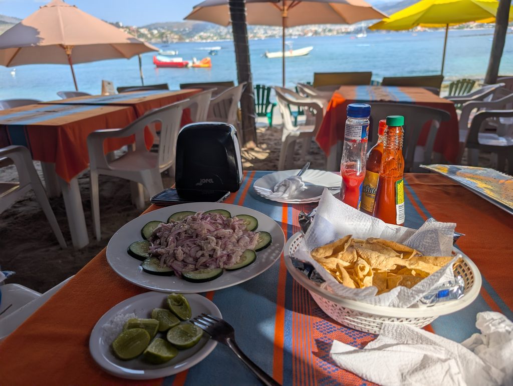 Otherwise, our life in Zihua is very normal – work most days, walks most days, beach a few times a week, and great Mexican meals at home and when dining out. Every meal we’ve had so far has been excellent. The standout meal at home was a fresh-caught dorado (mahi mahi) that I bought with Ami at the market that Chad served with verde sauce (made with tomatillos and other veggies from the market) and Mexican corn and zucchini. Our weekly rhythm has been eating out two nights a week plus a brunch or lunch out. On the days we eat out at lunch, we do a simple snack dinner (often popcorn, my favorite). This has worked well for us and felt pretty healthy.