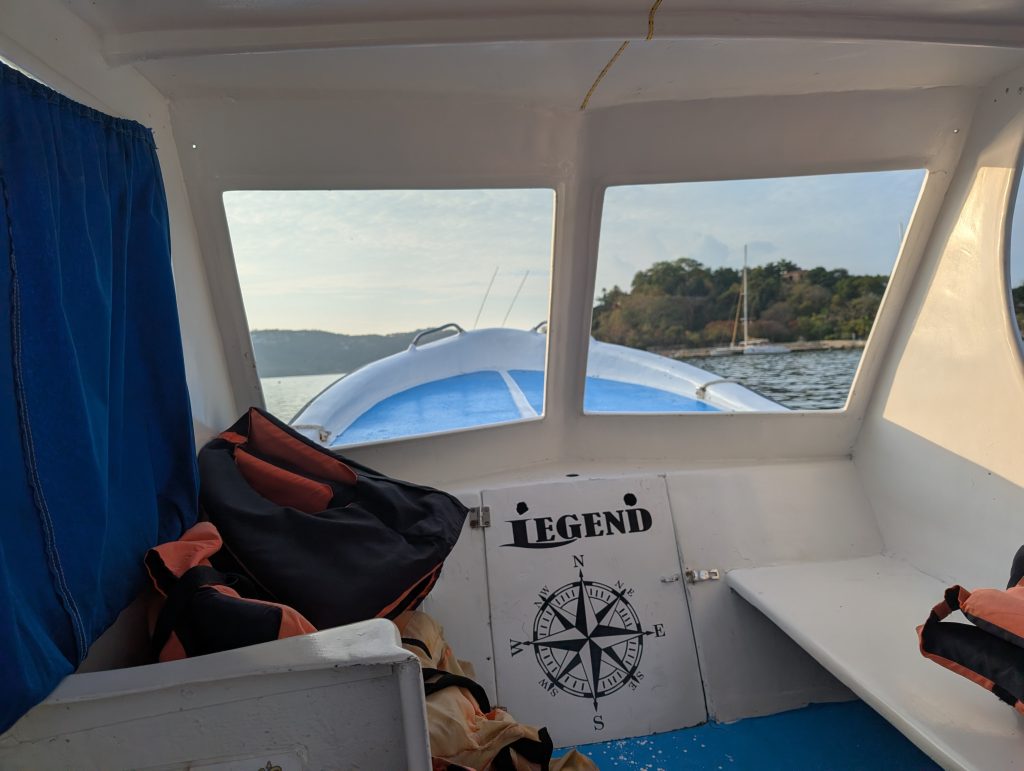 To save our energy, we took the water taxi over on the day we snorkeled. It is just 100 pesos ($5.60) per person round trip and goes back and forth regularly between Zihua’s pier and Las Gatas between 8 a.m. and 5 p.m. We arrived at the pier right at 8 a.m. to buy our tickets and were on our way by 8:15. It is a short ride across the bay and there was almost no one on the beach we we initially walked along it.