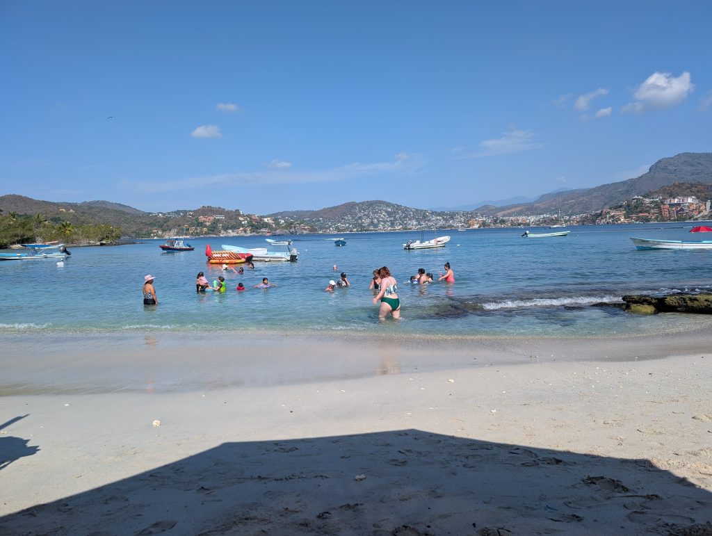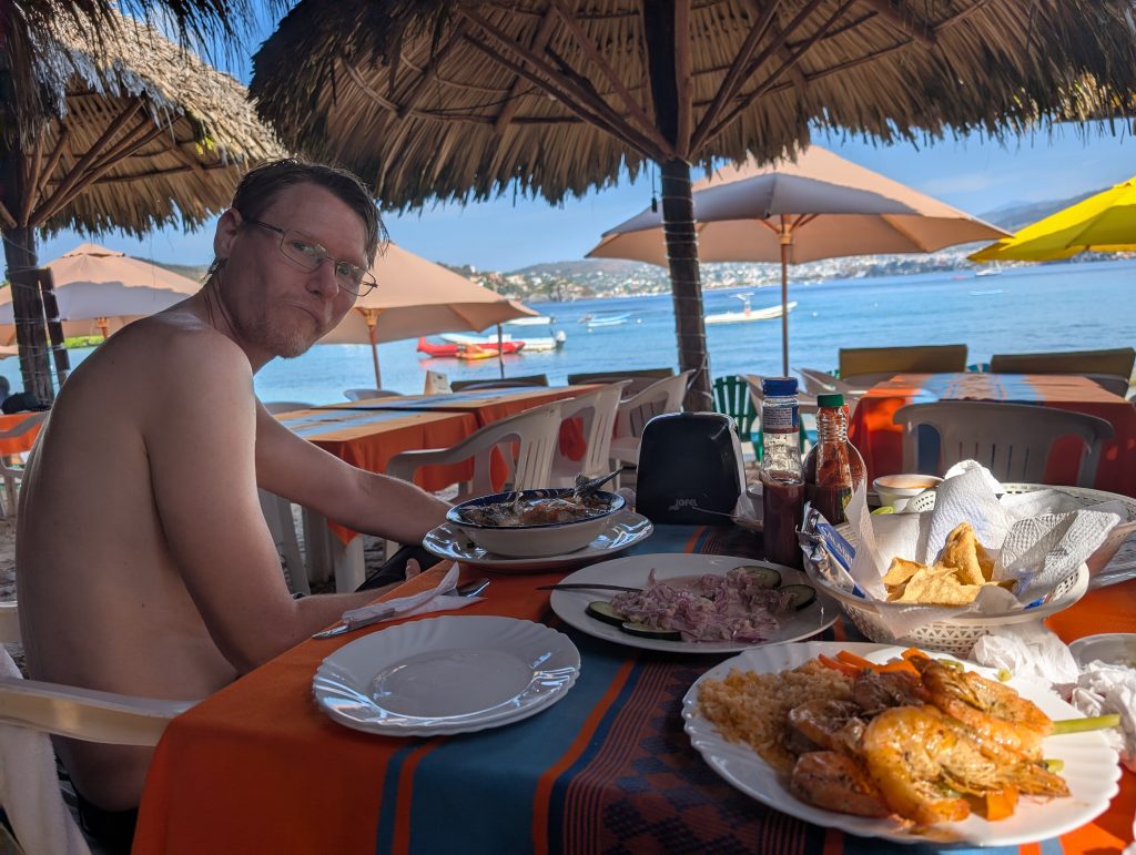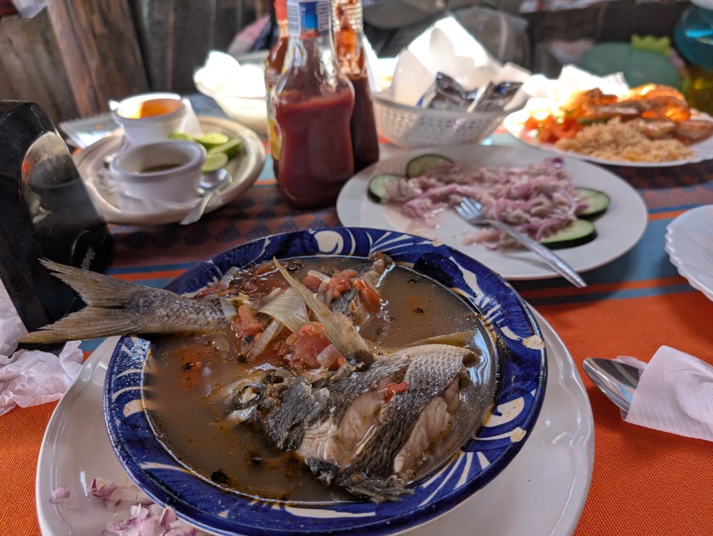 After snorkeling, we relaxed a bit and then enjoyed a delicious seafood meal. We started with las tiritas de pescado, a local specialty similar to ceviche. Then Chad ordered a fish soup and I got grilled shrimp. It was all very tasty and interesting. Chad’s soup had a whole fish in it, which we were told was a mojarra (similar to tilapia). My shrimp were very large and a bit messy to peal. It was a satisfying meal and after relaxing for a while longer, we took the taxi back to Zihua, dropped our stuff back at the house and then enjoyed our own less crowded beach for a while. It was a fun day.