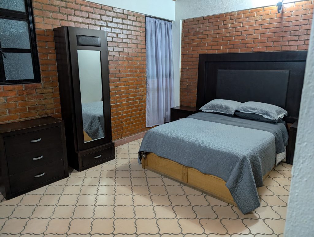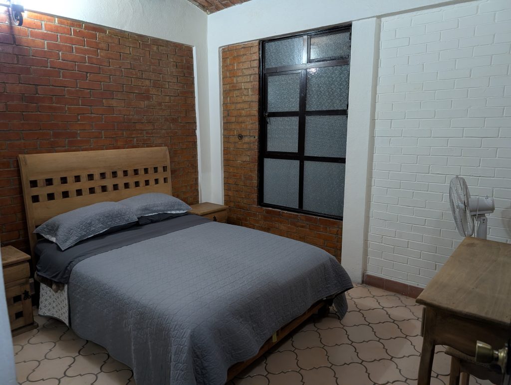 Though the apartment is spacious and charming with its vaulted brick ceilings, it was also very cold when we first arrived. Guanajuato has been in a bit of a cold spell for most of our first two weeks and this building, like most in the historic part of the city, doesn’t have heat. It just isn’t necessary for much of the year. We were warm enough overnight under a fluffy blanket and quilt, but getting up in the morning was really chilly, only about 16 degrees celsius (61 Fahrenheit). So we purchased a small space heater from the Soriana supermarket nearby when we did our grocery run. The heater has helped a lot, as have the sweats we purchased on sale from the Del Sol department store. Both a great, cheap investment in our comfort. We don’t need the space heater overnight, but it was helpful to run in the morning to heat up the bedroom where I work before Chad moves it to his dining table workspace for the morning. He usually doesn’t need it in the afternoon, at which time I use it from time to time in the bedroom. It has worked pretty well.