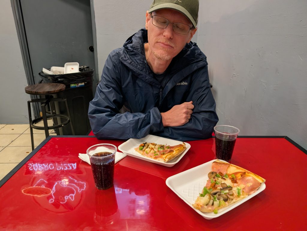 After the host left, we went out for a quick late dinner of pizza by the slice, a great value at just 35 pesos each ($2), including a free cup of coke.