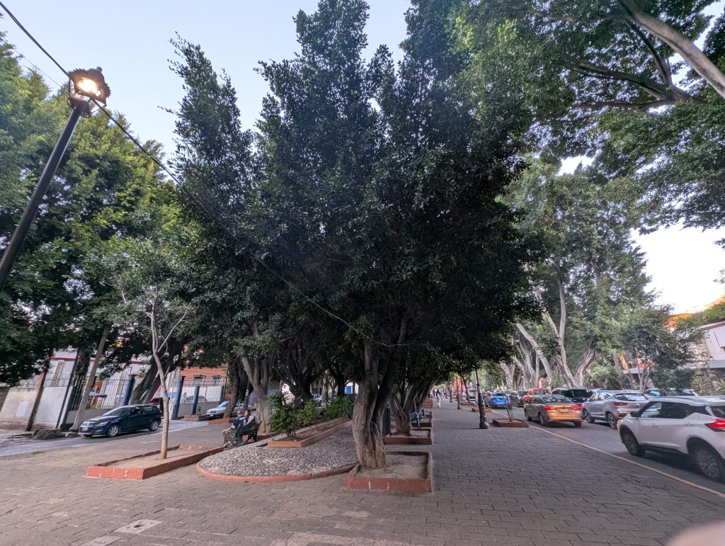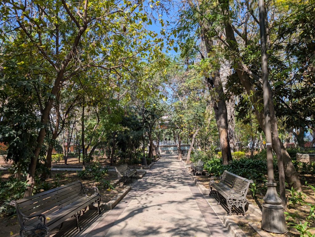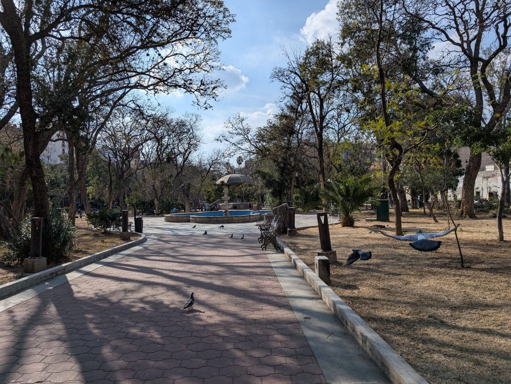 Guanajuato also gave us a wonderful Valentine’s Day. After working until mid-morning, we took a taxi out to an area called Presa de la Olla, where there’s a manmade lake and several parks. We enjoyed walking around and a picnic in Parque Florencio Antillón, which was very lush and pretty. Then we made our way on foot back to town, stopping along the way for an espresso drink from Cafe Madeline in Presa 97, a cool historic building that is now an shopping and art space, then picked up some aged manchego from an artisanal cheese shop recommended by Tim, and ended up at the Plaza de la Union, the most romantic square, for an early afternoon cocktail – a strawberry mojito for me and a posion tulun for Chad, which had mezcal, lime, maracuya, and ginger.