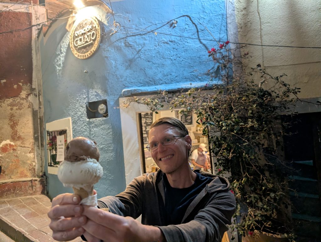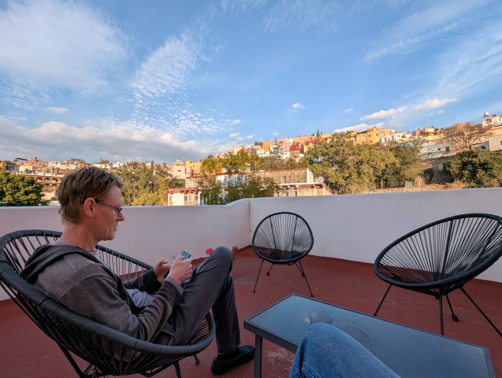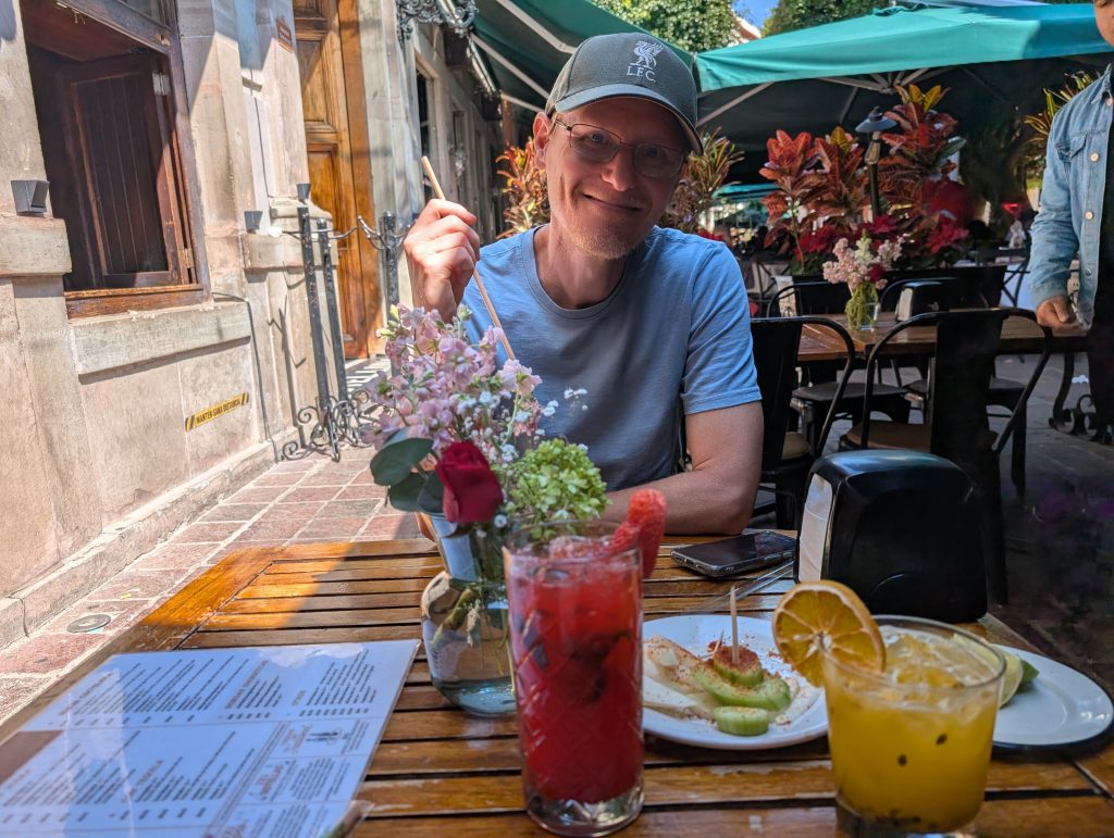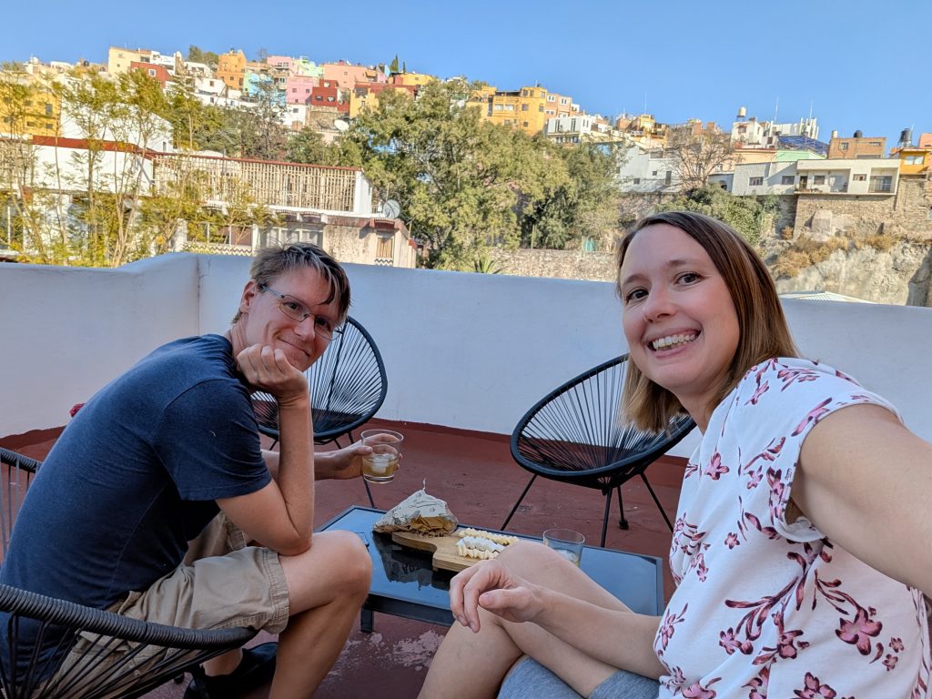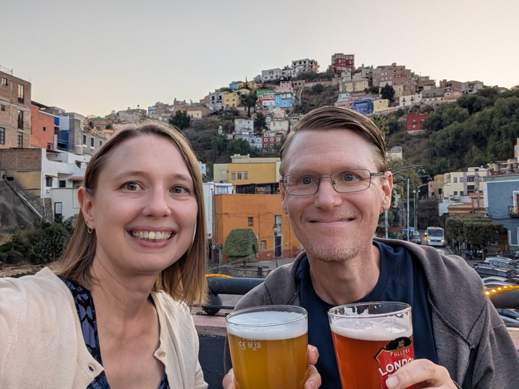 In addition to his newsletters, travel writing, and tour, Tim also wrote the book A Better Life for Half the Price, which significantly influenced our early research into our travel lifestyle and the first destinations we chose. Here’s one of my early blog posts that talks about how we used Tim’s book. We have very fond memories of poring over it on our porch as we started planning. In fact, looking back at my Amazon history, we ordered Tim’s book on the very day Chad and I decided to travel full-time, March 11, 2017! It was a privilege for Chad and I to buy him a few “thank you” beers for his work helping so much in those early days. And, as a resident of Guanajuato for the past several years, he was able to give us quite a few helpful tips and restaurant recommendations. I’m really glad we chose to meet up with him.