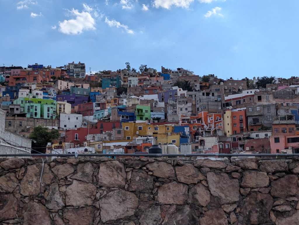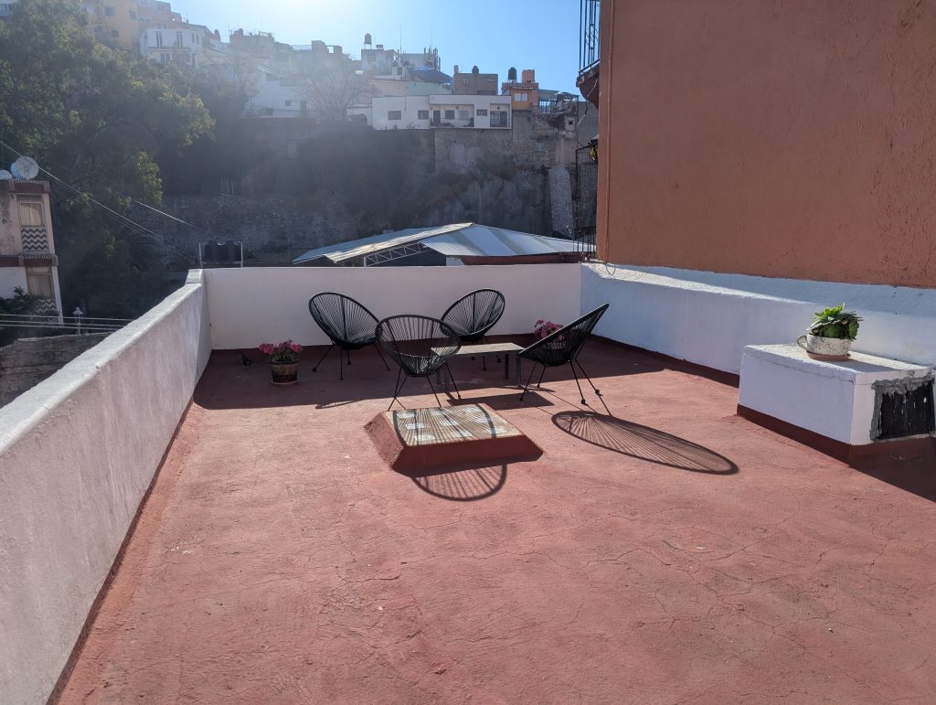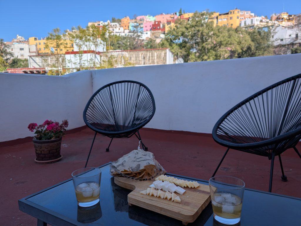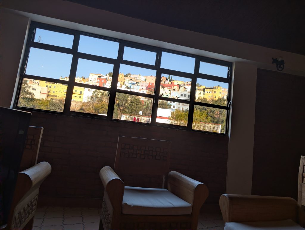The best part of our Airbnb is the large terrace which has a view of some of Guanajuato’s colorful homes and from another angle the Alhondiga, an important landmark in Mexican history that is now a museum we’ll visit in the second half of our stay.