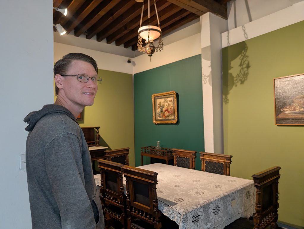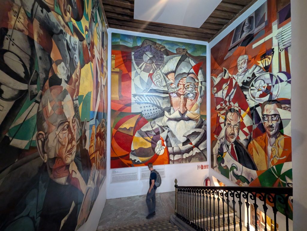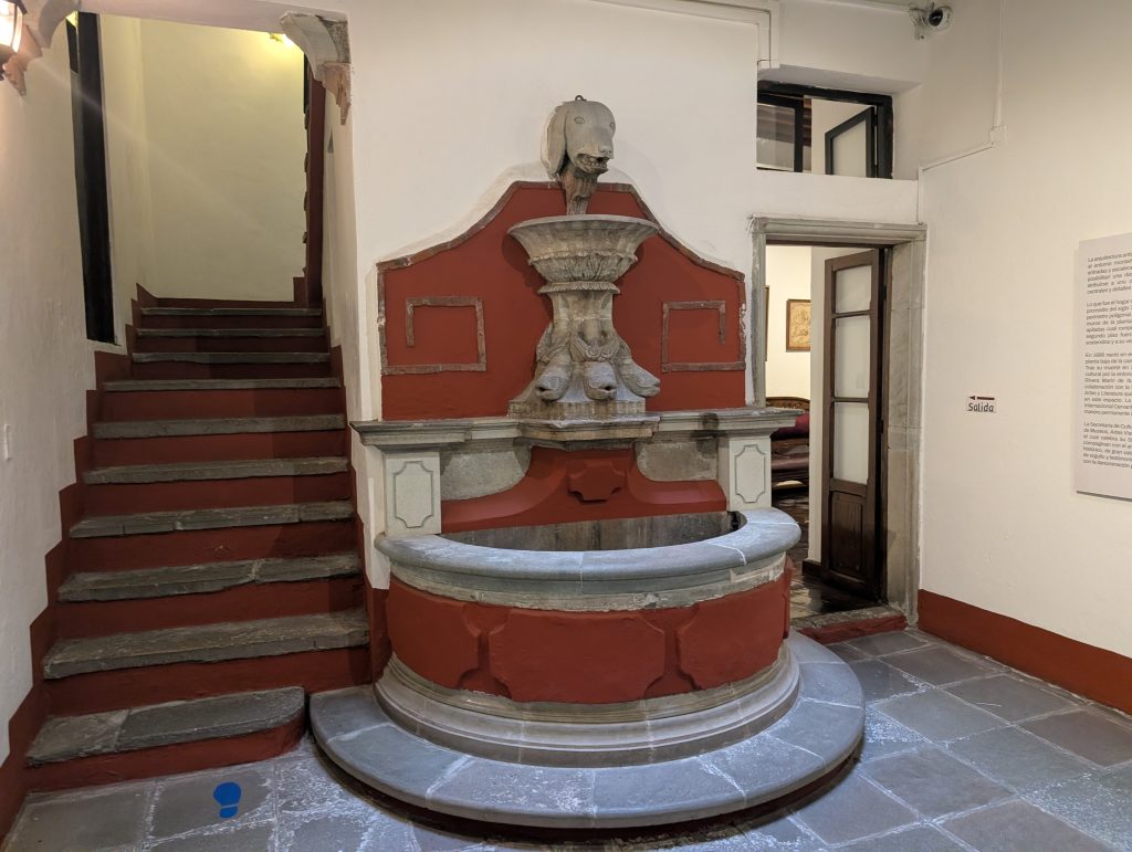 Before our drinks with Tim, our first museum visit in town was to the historic home of artist Diego Rivera. It was great for both in showing off the colonial architecture and late 19th century style he grew up in and showcasing some of the evolution of his art through the years. In the ground floor there was a temporary exhibit about his wife, Frida Kahlo, during her mid-20th century hospitalizations. It was all very interesting and worthwhile. A low ticket price too, at 31 pesos each (less than the pizza slice!). The museum didn’t allow photos of Rivera’s art but here a couple of the home.