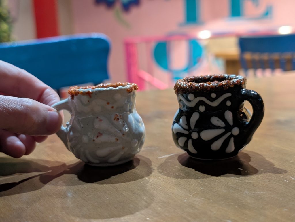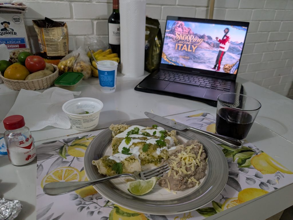 In our two weeks here, Chad has continued his exploration of Mexican cuisine and cocktails here in Guanajuato. He made veggie enchiladas from scratch with tortillas from the tortillaria downstairs and his own salsa verde recipe. He’s also developed a delicious tequila old-fashioned using repasado, agave, and orange bitters. And for the Olympics opening ceremony, we finally tried the carajillo cocktail, a mix of espresso (made with decaf ground espresso brewed in Chad’s aeropress) and Liquor 43, the Spanish liqueur we tried in Zihua.