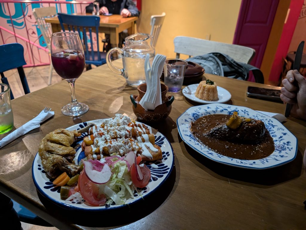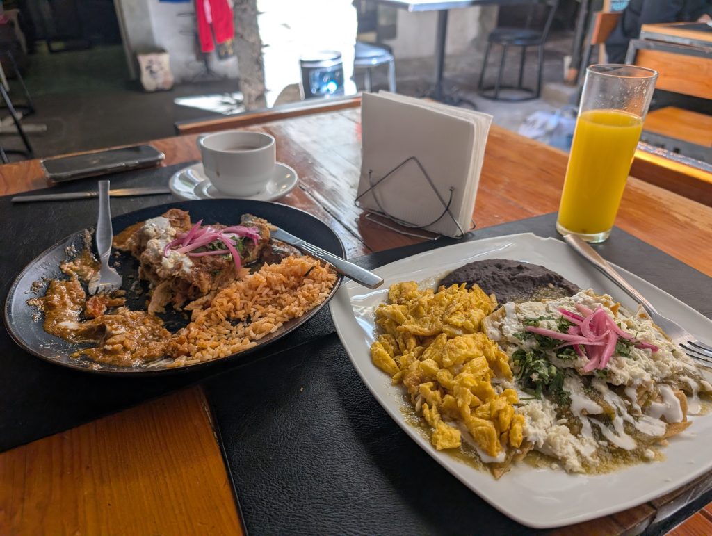 The hike was really fun and took just under two hours, though we took some sidetracks and did our own exploring based on Chad’s trails app. The scramble up the rocks to the main view area wasn’t too bad. All along the hike, the views over the city were quite beautiful and it was fun to be out in nature. Since it was Saturday morning, there were a few other groups out, but the trails weren’t at all crowded. Instead of retracing our steps back down the steep rocks, Chad found a longer but less steep alternative route back to the path just after the cave. After the hike, we got an Uber to take us back to town and went out for a tasty late breakfast of chilaquiles and enchiladas at Maria Cocina Urbana.