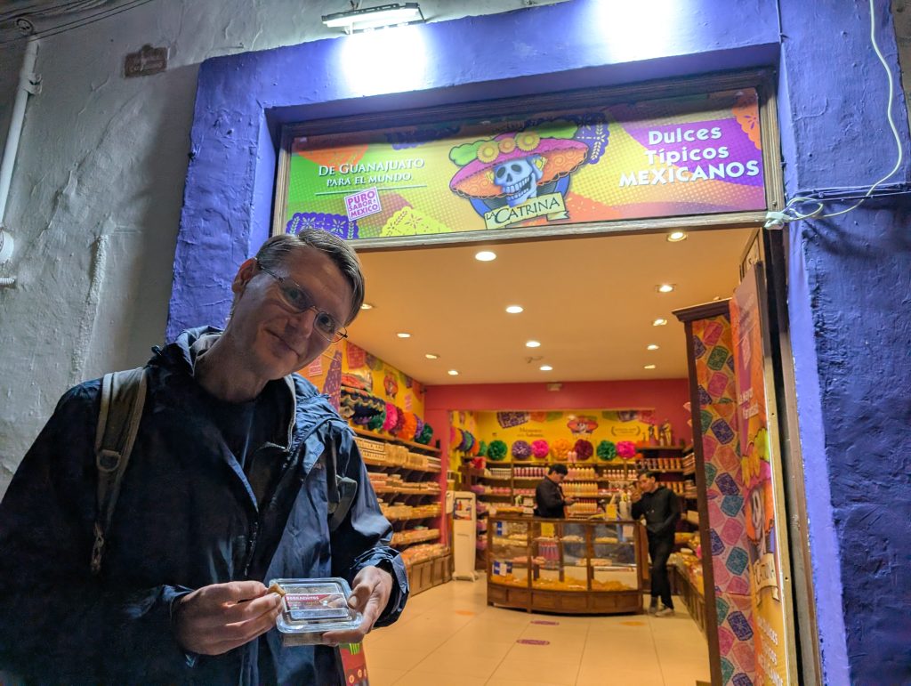 Meals out have also been fun. We’re still doing a cheap night out, fancy night out, and lunch/brunch. Our first dinner out was at Restaurante Corazón Mexicano, where we tried the local specialty, enchiladas mineras with chicken (hearty miner fare) and chicken with an indigenous mole recipe. Both were very tasty. Afterwards we went to one of the many local candy shops to buy something cajete flavored. Cajeta is a Guanajuato specialty that is goat milk caramel.