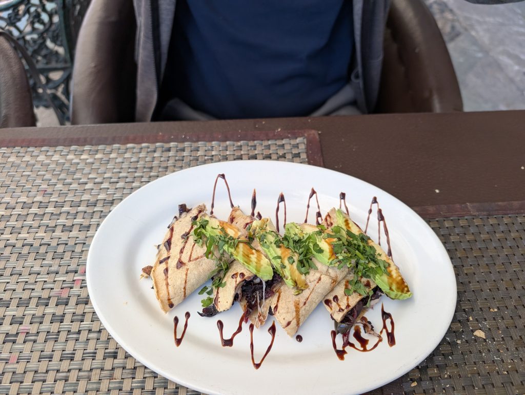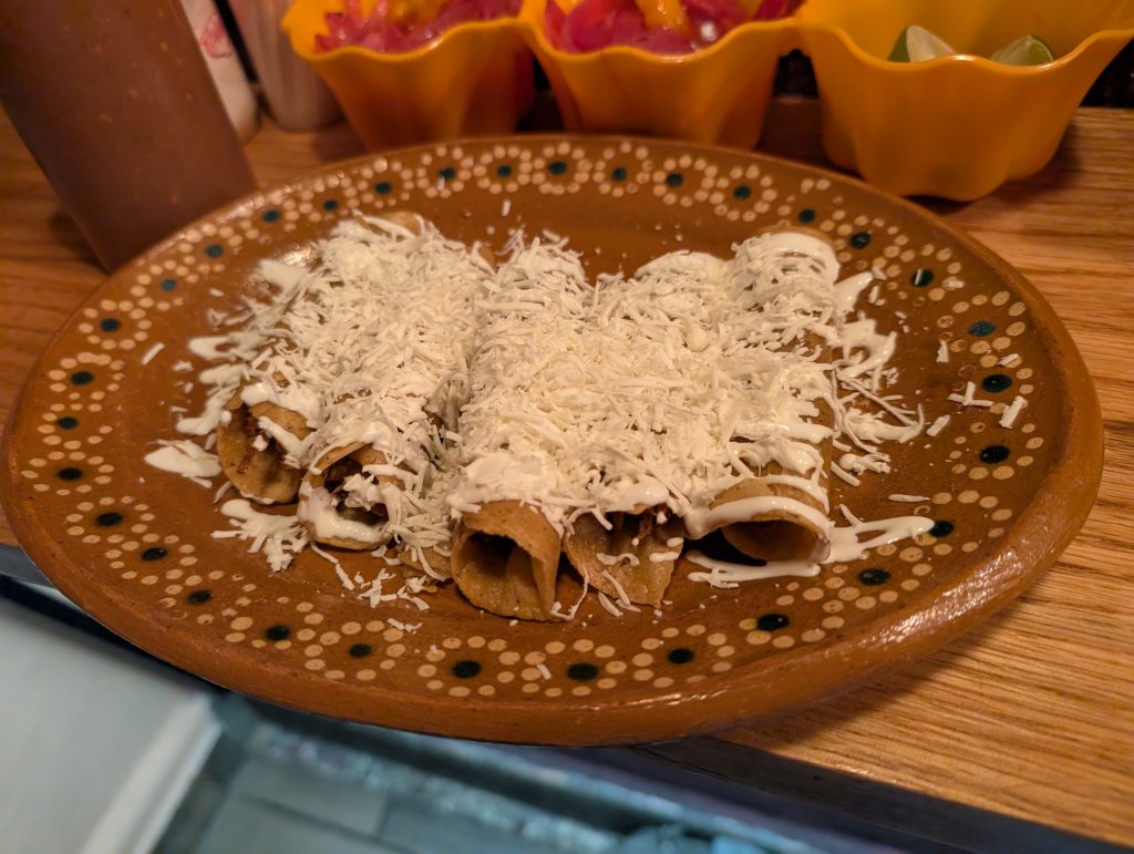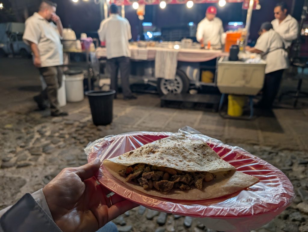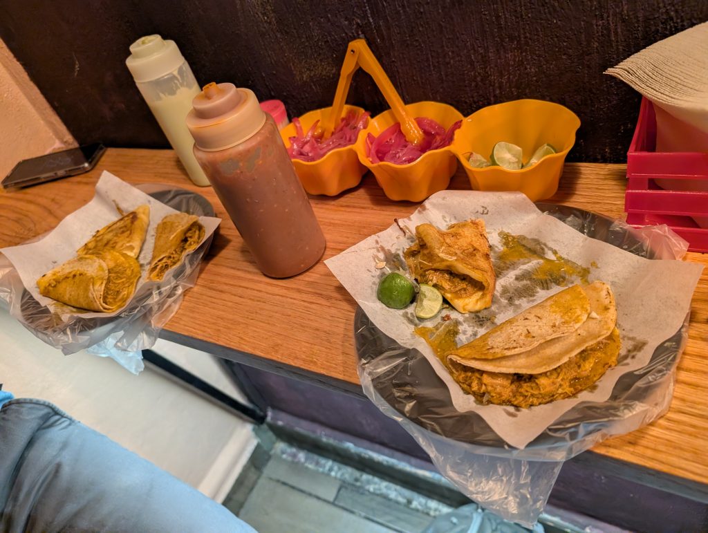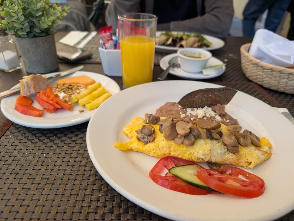 Other nights out included street foods like esquites (street corn in a cup with crema and spices) and a fantastic stuffed quesadilla from the food cart across the street from our plazuelita. Another time we went out to Francisca’s where I tried a local Guanajuate rosé and Chad tried an añejo (aged) tequila. We’ve found another excellent gelateria here called Estación. On our last cheap night out, we went to T-tela Cochinita Pibil to try the Mexican pulled pork in tacos, a quesadilla, and flautas. The last photos are of our brunch after our private tour – mushroom omelet for me and a quesadilla with jamaica (hibiscus) for Chad, which we didn’t really care for.