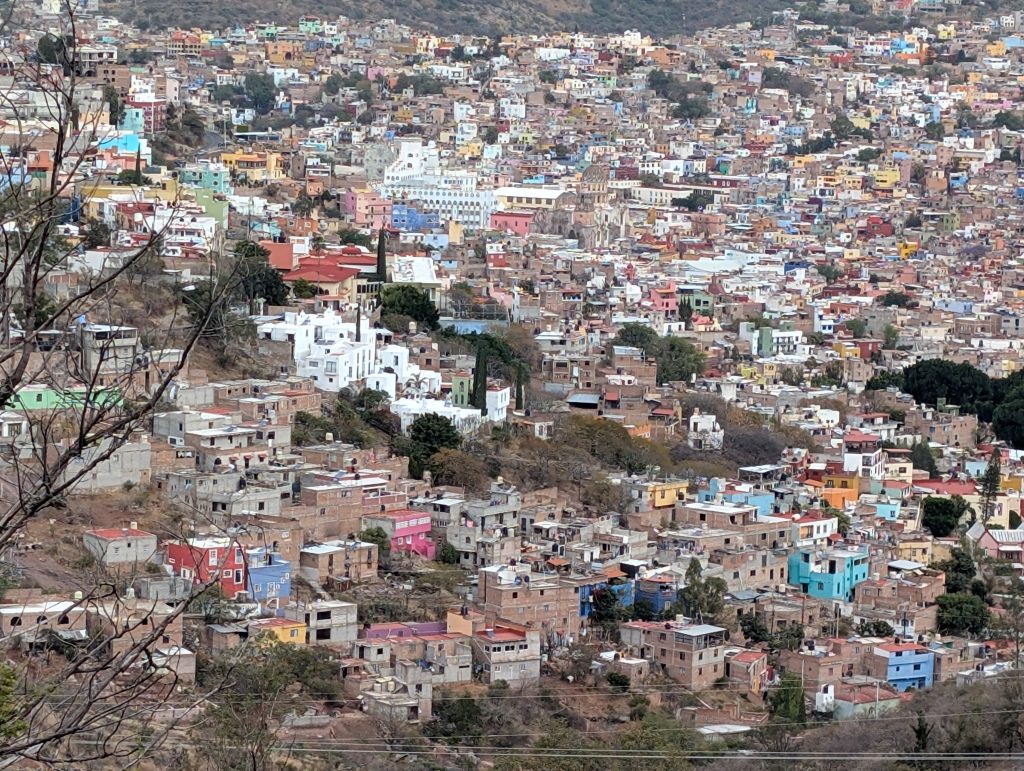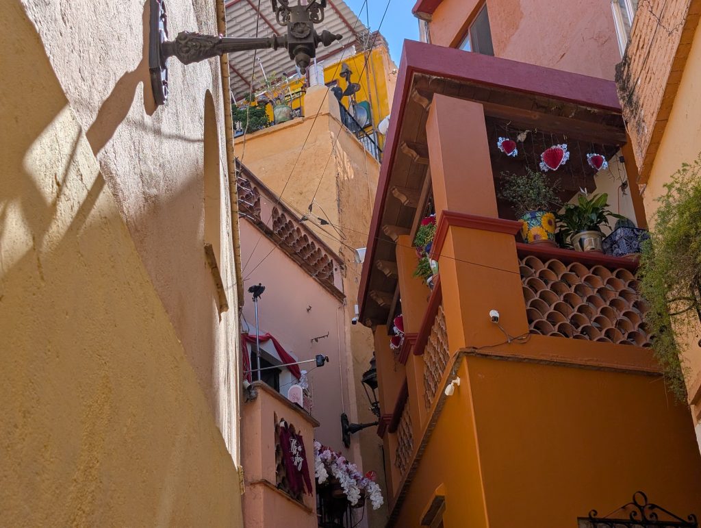 Our flights from Zihua to CDMX and CDMX to Leon (the closest airport to Guanajuato) were very short and on time. Despite that, it was a long day. Once we’d picked up our luggage, we decided an Uber would be easiest to get to Guanajuato. I’d done some research and the app indicated it would pick up just outside the arrivals door. However, it turned out that Uber can’t come into the airport proper and we had to walk 10 minutes with our luggage to meet the driver. I also think it might have been a little more expensive than a taxi at $30 plus tip. Lesson learned – next time I’ll at least look into doing a taxi before defaulting to Uber. I think we would have arrived sooner.