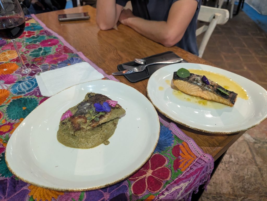 After a rest and shower, we made a cheese plate to enjoy on our terrace and then went out for dinner at an upscale restaurant called Mestizo where I’d made reservations a week ago. We had a mixed experience at the restaurant but enjoyed our interesting salads and two indigenous inspired fish dishes: robalo with pipián sauce (indigenous recipe with ground pumpkin seeds, herbs, and spice) and salmon in xoconostle (a type of cactus fruit) marmalade.