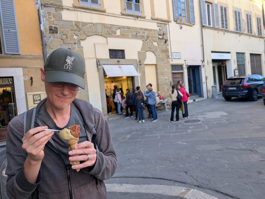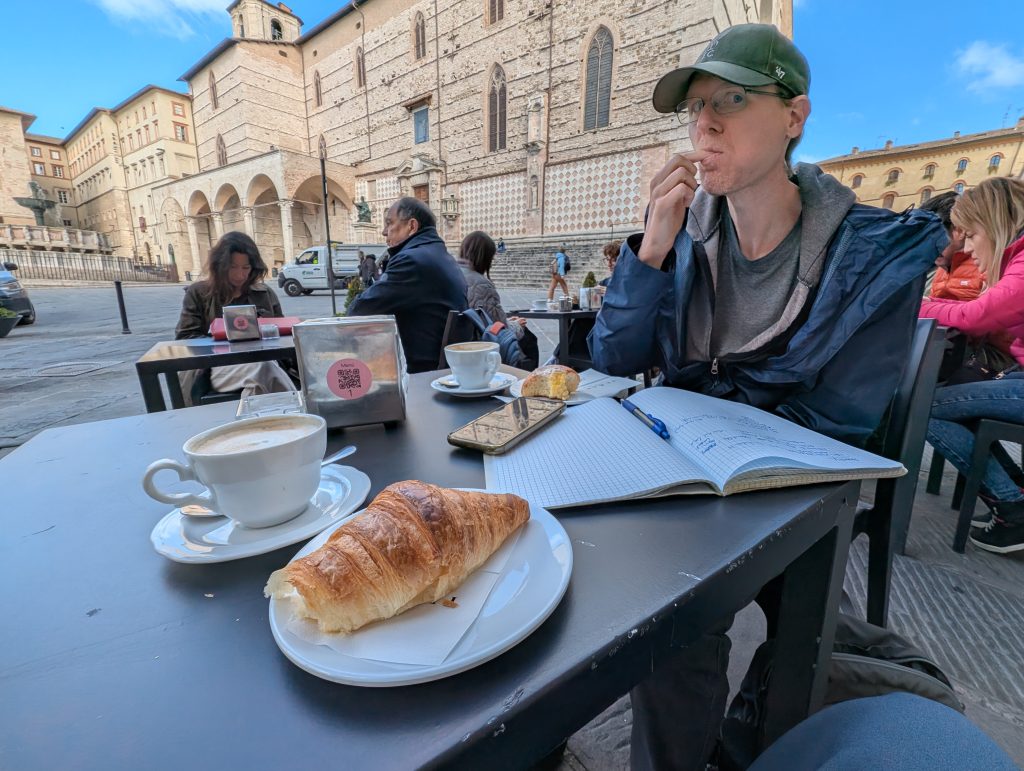 We followed up our basilica visit with gelato for Chad from Gelateria Sunflower, a very popular shop near the basilica. We’d considered staying in Arezzo for dinner because it has many well-reviewed restaurants but feeling tired and not too hungry after our late picnic, we decided to head on back to Perugia. In the late afternoon and evening the trains between the two cities run every hour so we bought tickets for the next one on the Trenitalia app and were back in Perugia before 7 p.m.