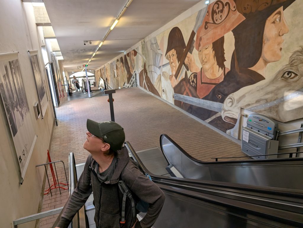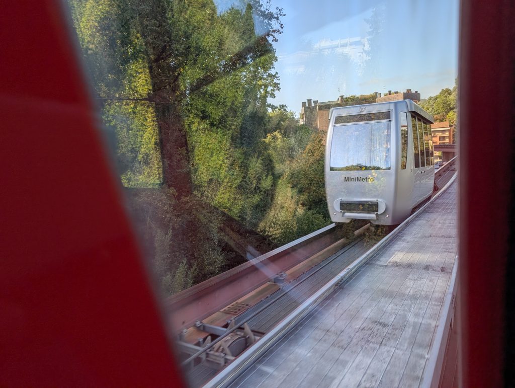 We made a later start for Arezzo than our other day trips because the morning direct trains were only at 6:37 and 9:50 a.m. (I found in an email to Chad from when I was planning the day). We opted for the later departure time and started our day with cappuccino and pastries in Perugia. Instead of walking to the train station, we took the mini-metro, the adorable single-car automated public transit that costs just 1.5 euros each way (and you can just tap your credit card to enter). The train was about 8 euros per person each way, so our total transportation cost for the day trip was $45.