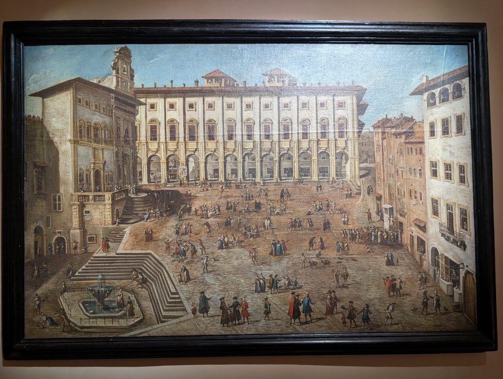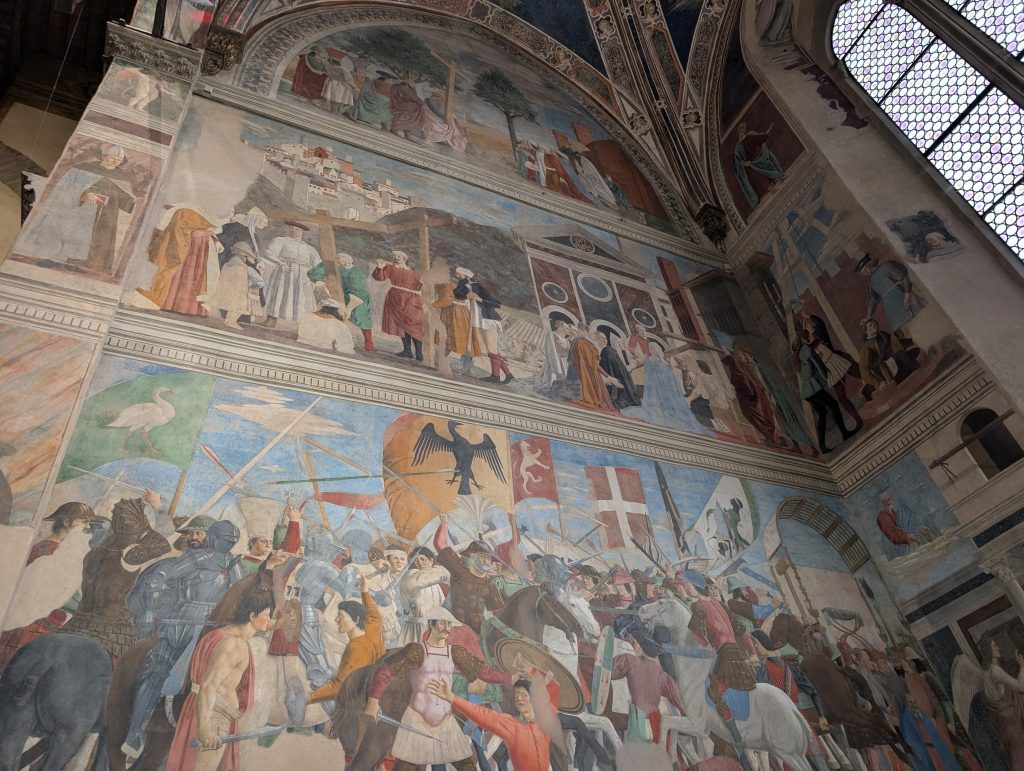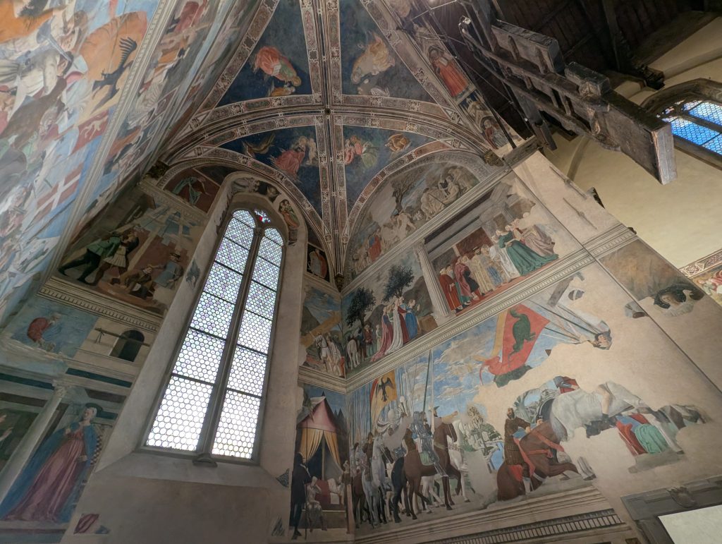 The church interior was pretty and had some other interesting frescoes and art to enjoy as we made our way to the famous frescoes behind the alter. The frescoes show various episodes in the Legend of the True Cross, this medieval concept linking Jesus’s cross to a tree in the garden of Eden. The legend says the cross was then found in late antiquity by the mother of Roman Emperor Constantine after he had a dream about it. It became a symbol of the “righteousness” of their religious war, which is not my favorite side of Christianity. Still, the frescoes were very beautiful and interesting as an example of the shift from early Renaissance to high Renaissance art.